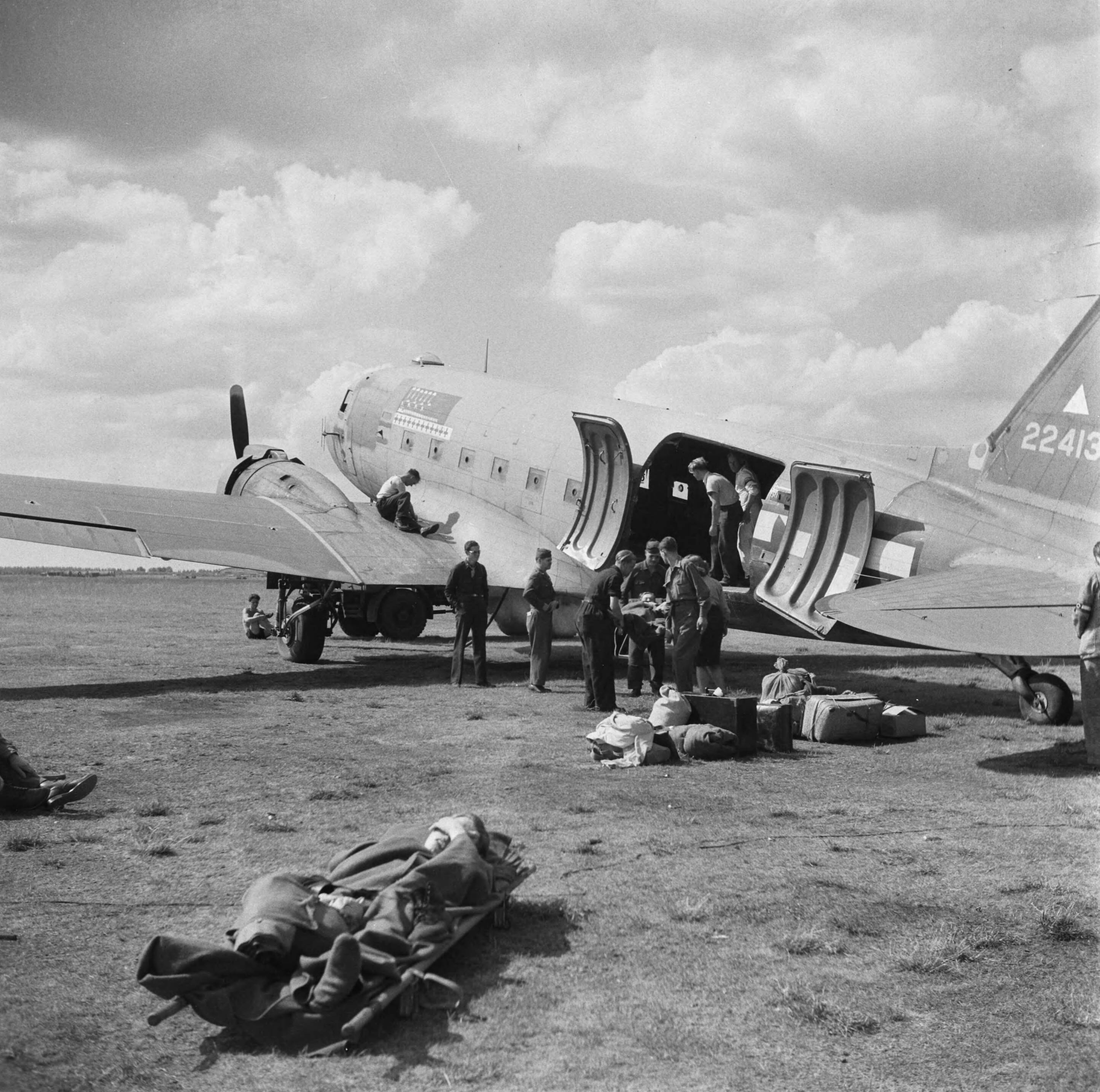 Vliegveld Eindhoven. Zieken of gewonden op brancards voor een gereedstaand vliegtuig