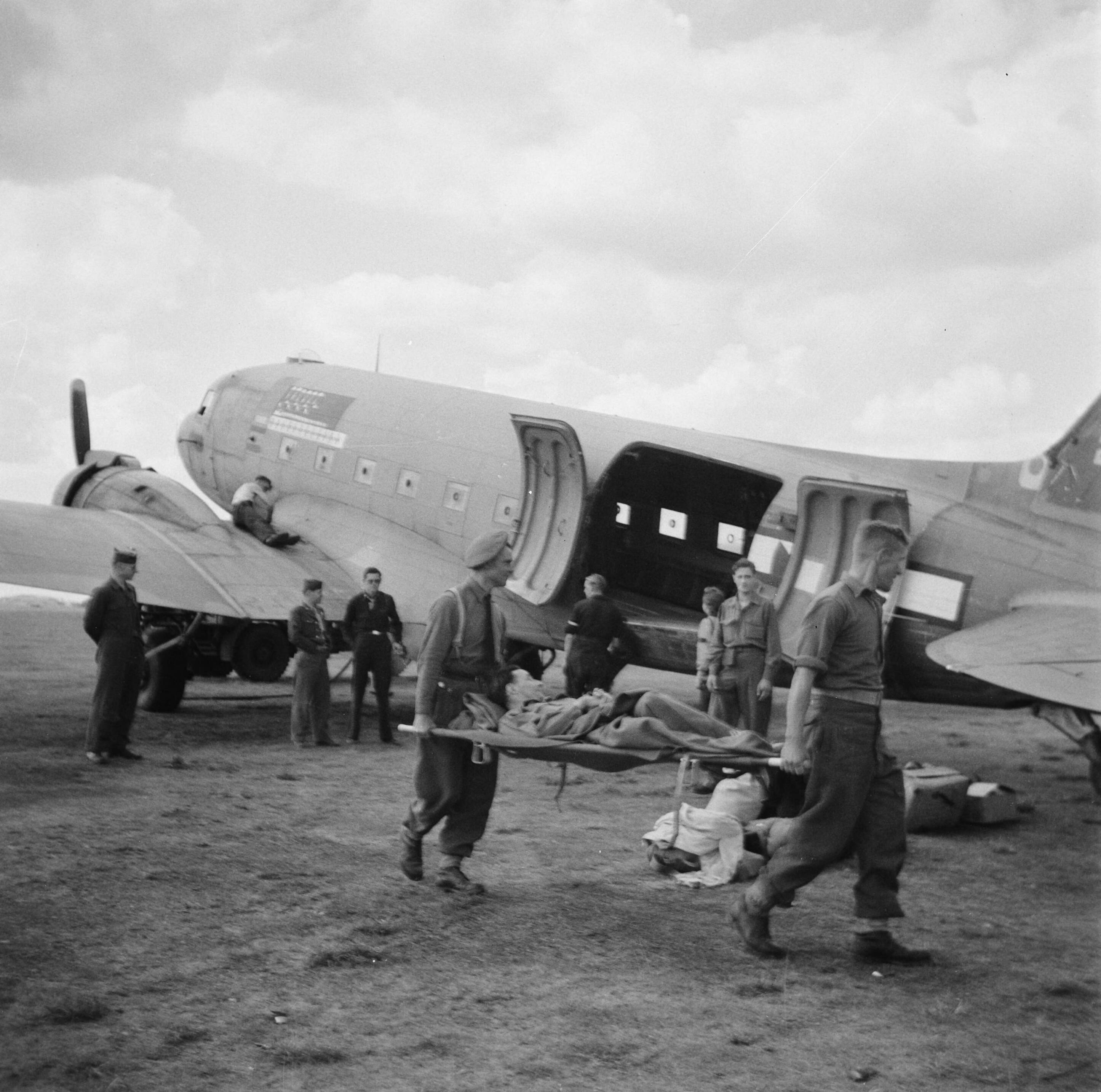 Vliegveld Eindhoven. Zieken of gewonden op brancards worden in of uit een gereedstaand vliegtuig gedragen