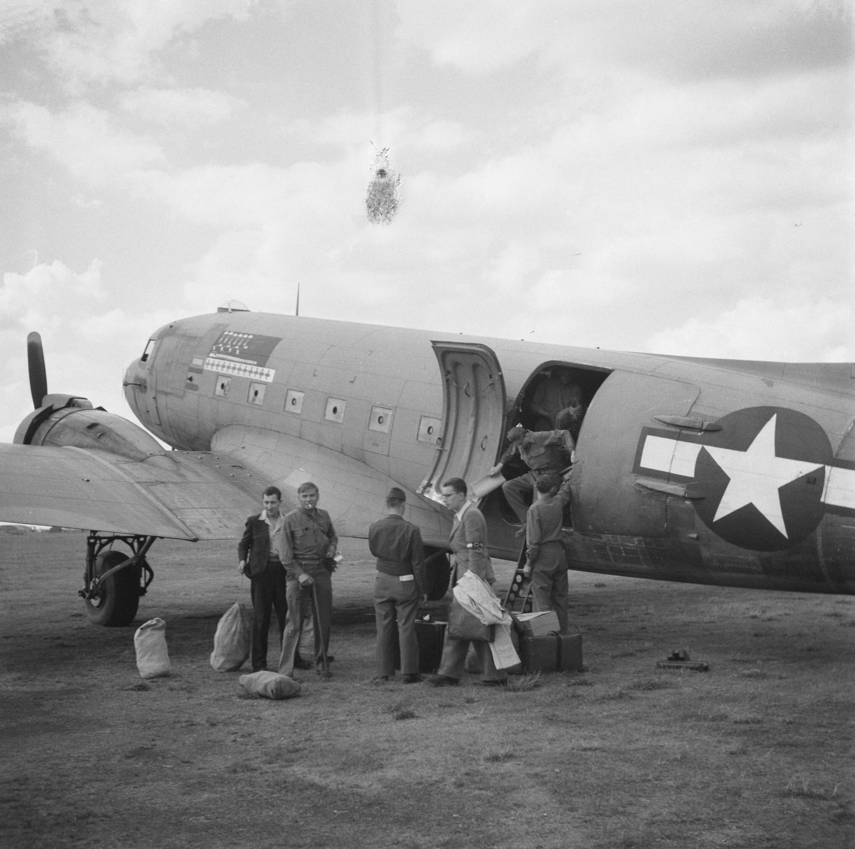 Vliegveld Eindhoven. Mensen met bagage verlaten een vliegtuig