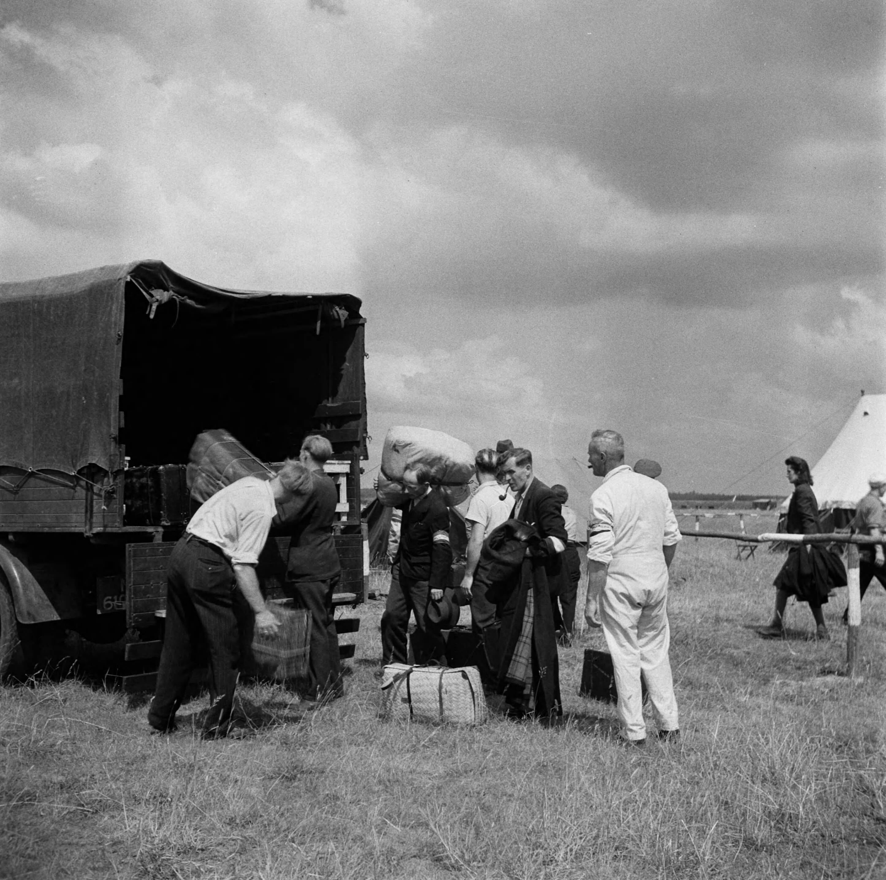Vliegveld Eindhoven. Bagage wordt in een vrachtauto geladen