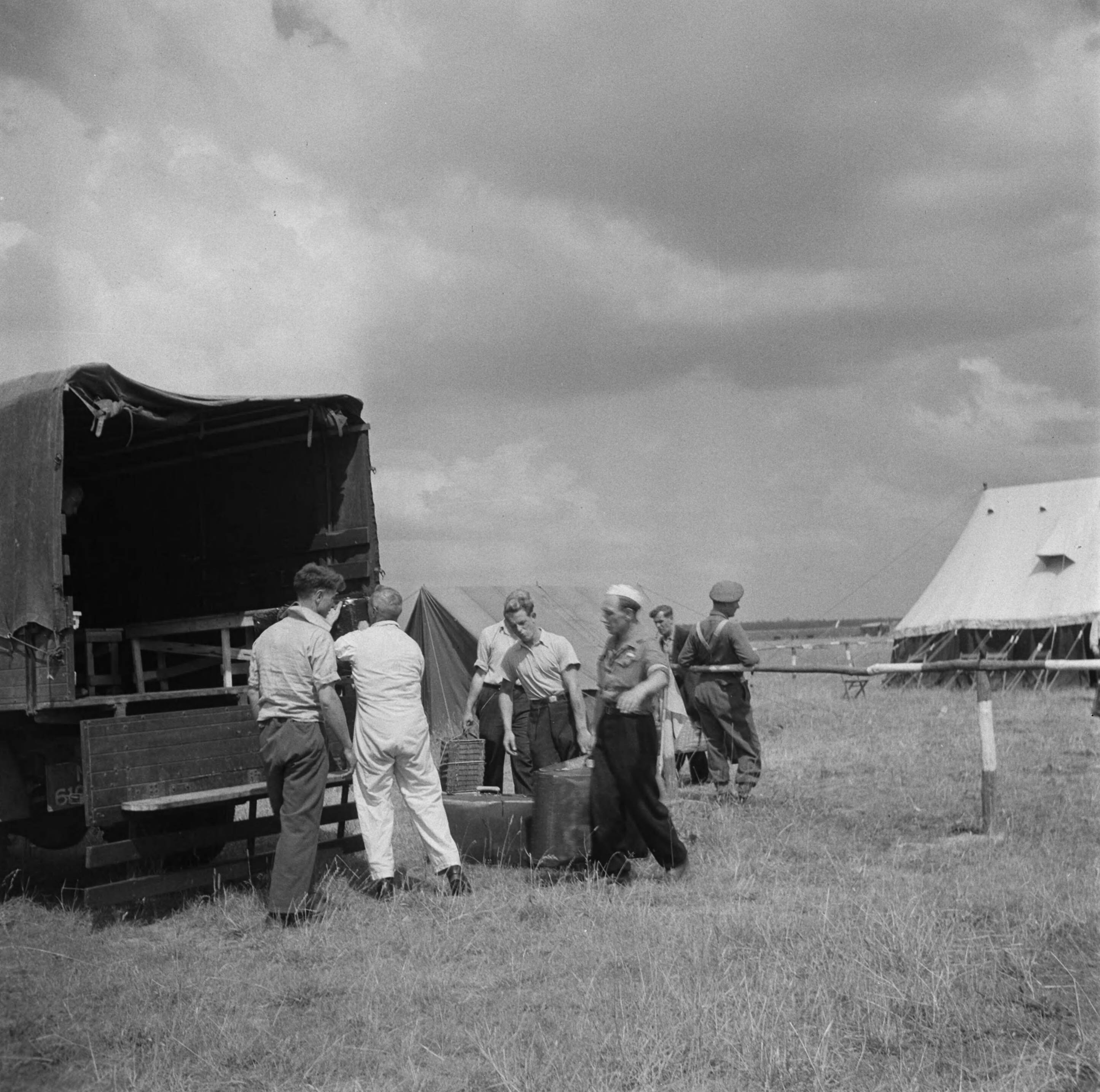 Vliegveld Eindhoven. Bagage wordt in een vrachtauto geladen