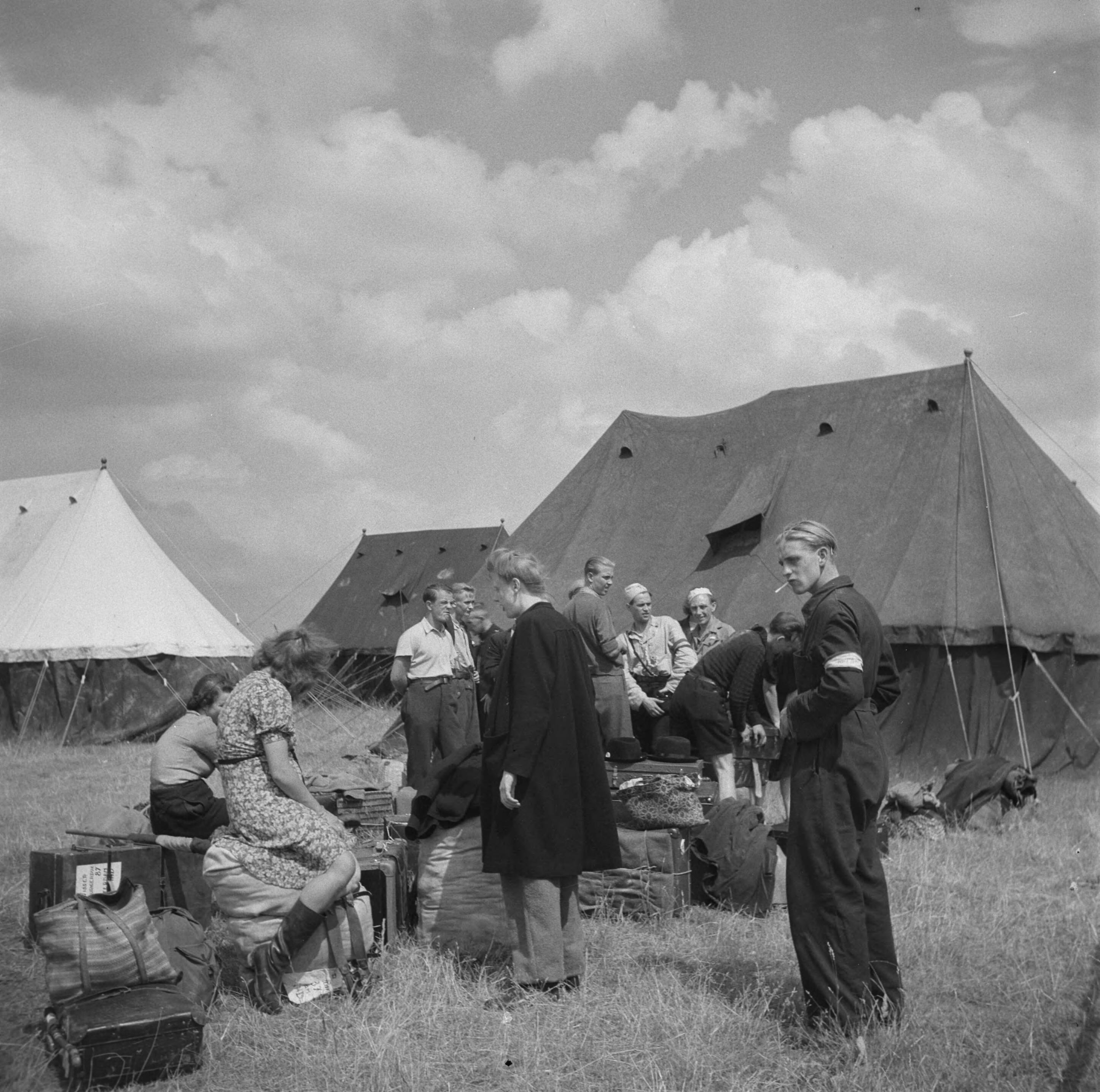 Vliegveld Eindhoven. Repatrianten met bagage bij tenten