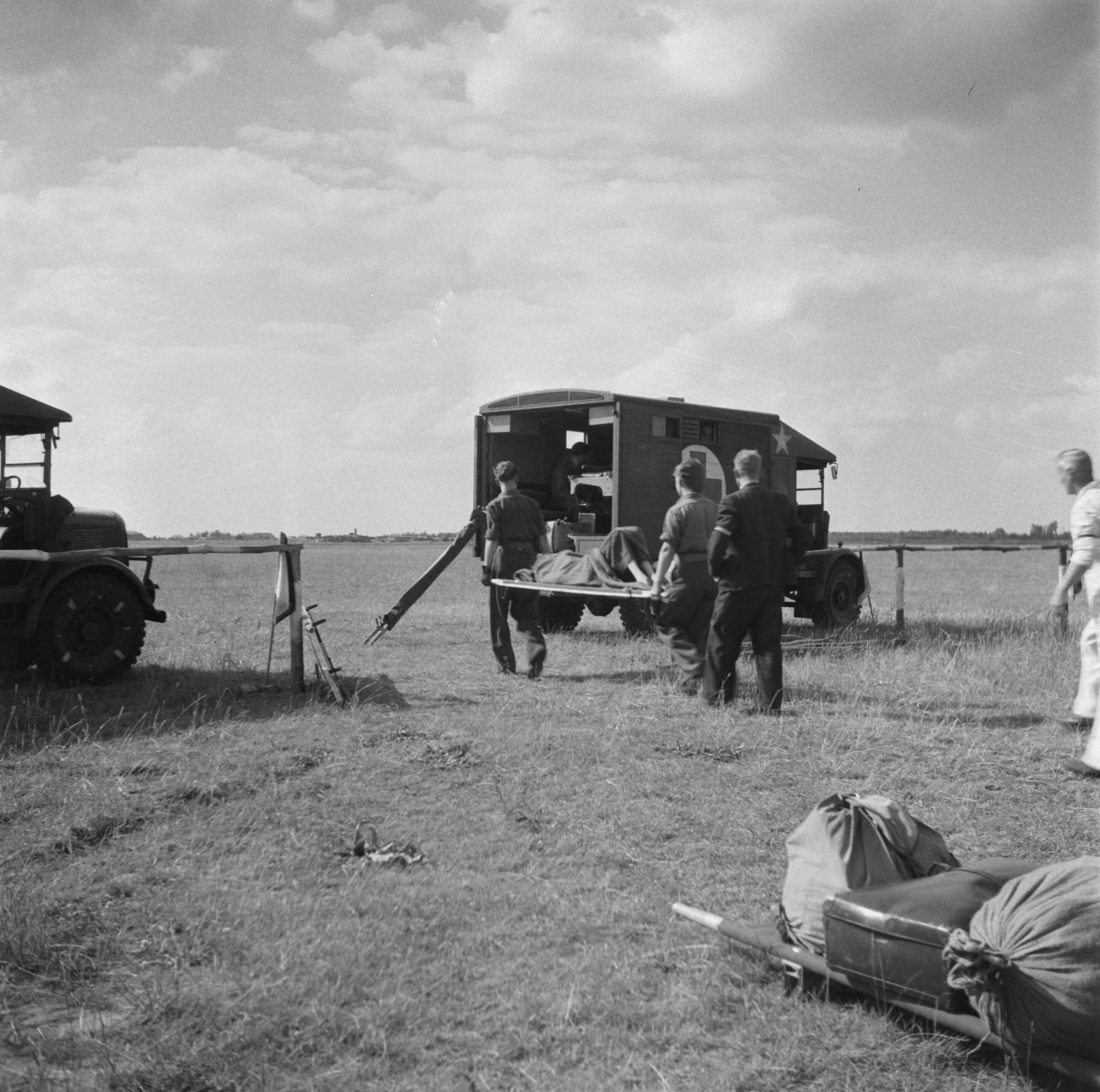 Vliegveld Eindhoven. Een gewonde of zieke op een brancard wordt naar een ambulance gebracht
