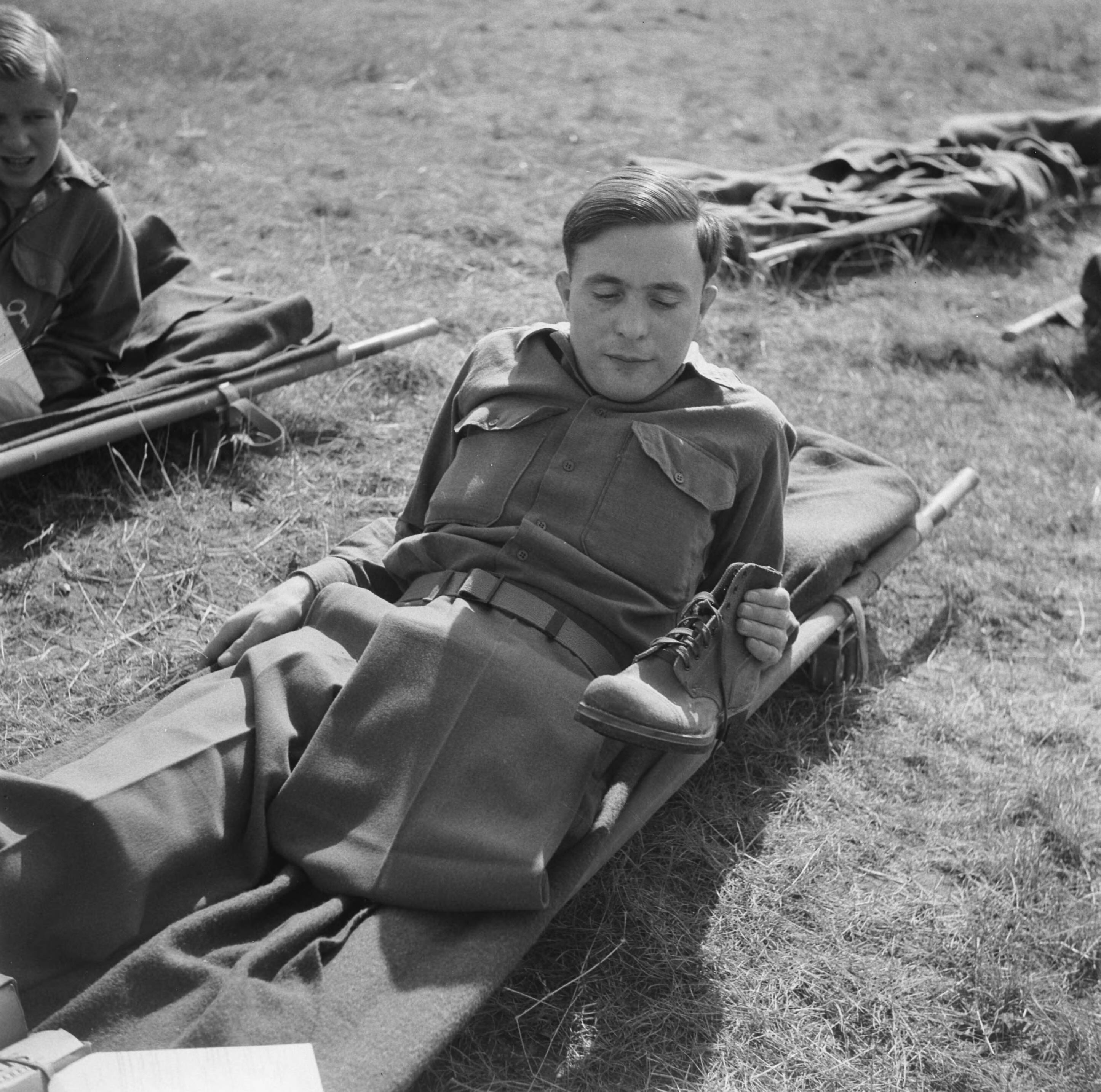 Vliegveld Eindhoven. Een militair zonder been houdt een schoen vast