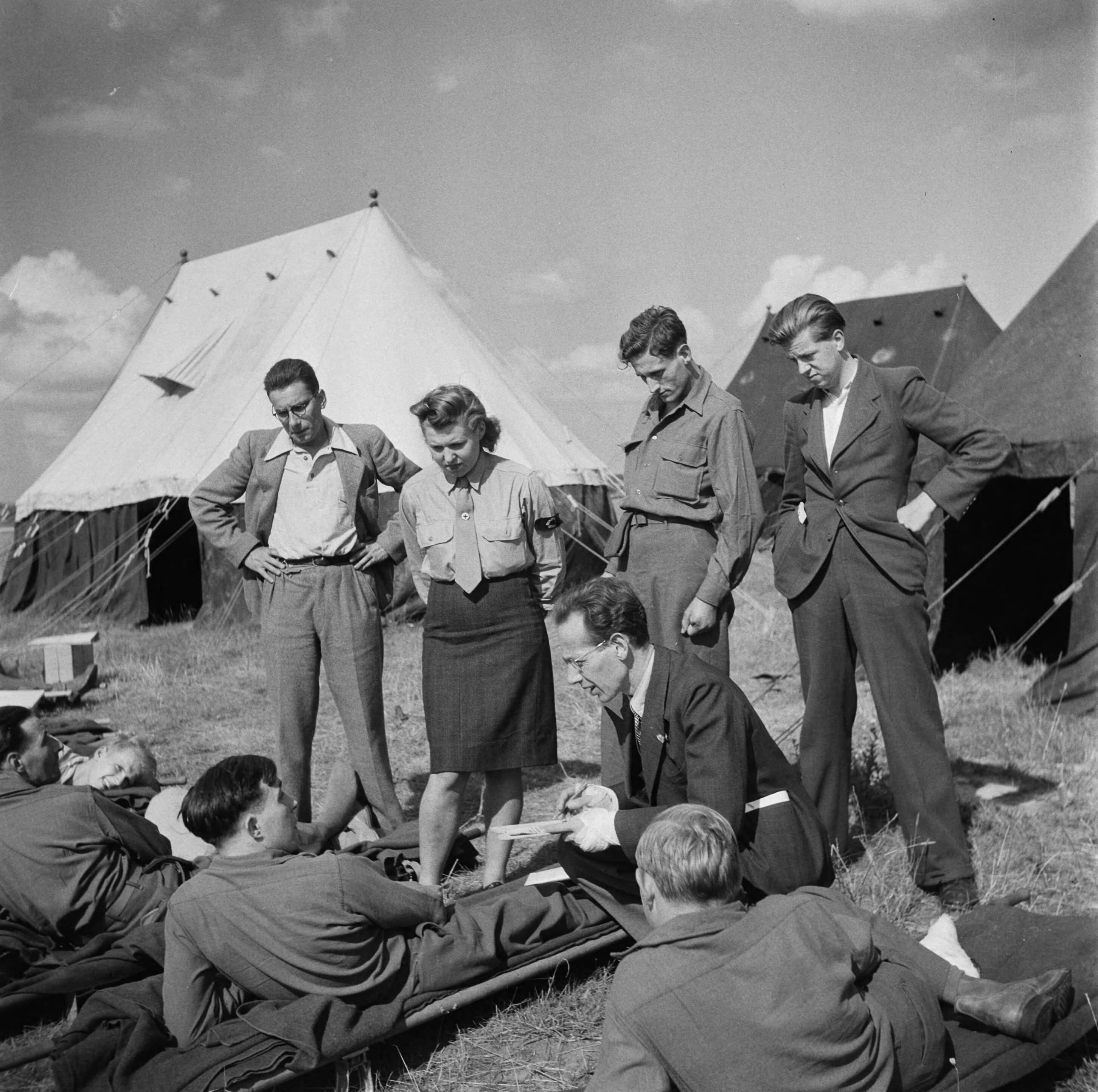 Vliegveld Eindhoven. Een man spreekt met gewonden of zieken op brancards