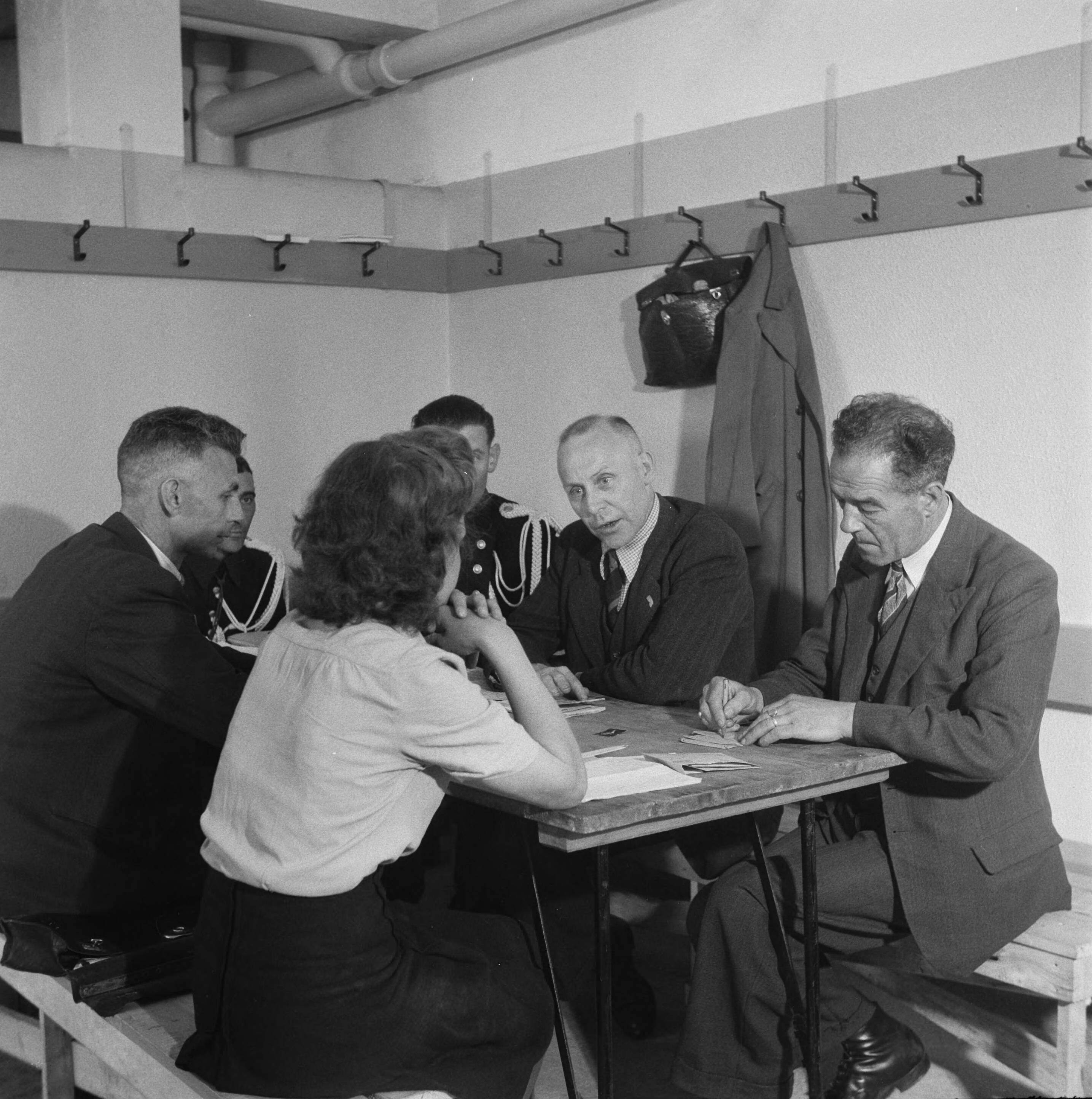 Een groep mensen, waaronder een vrouw en een twee leden van de marechaussee rond een tafel in een kleedkamer tijdens een bespreking