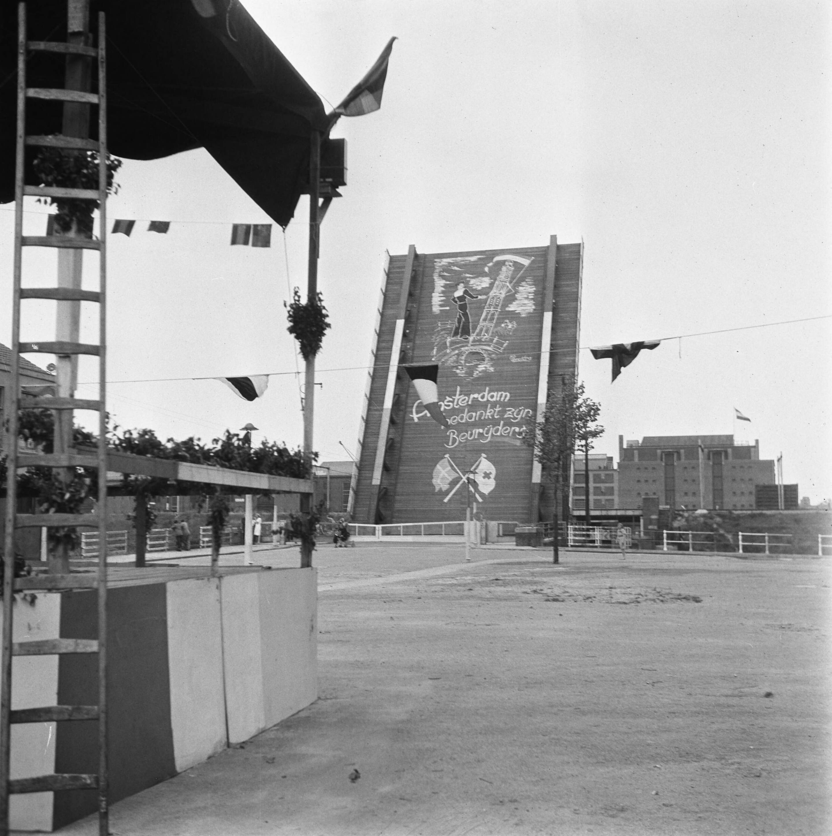 De vloer van een ophaalbrug is met straatkrijt volgetekend. "Amsterdam bedankt zijn bevrijders