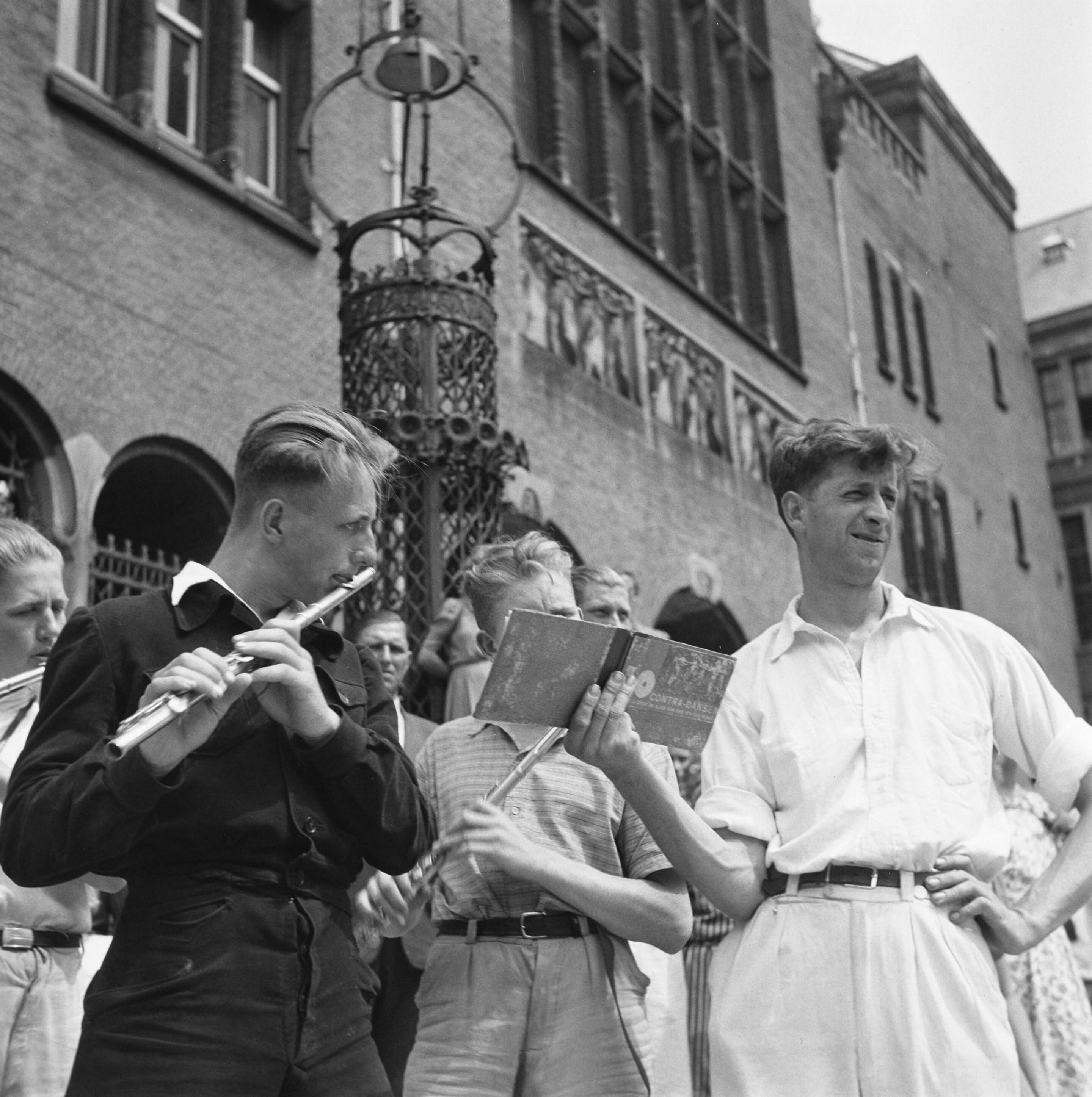 Fluitisten bij de Koopmansbeurs. Een man houdt een boekje met bladmuziek omhoog