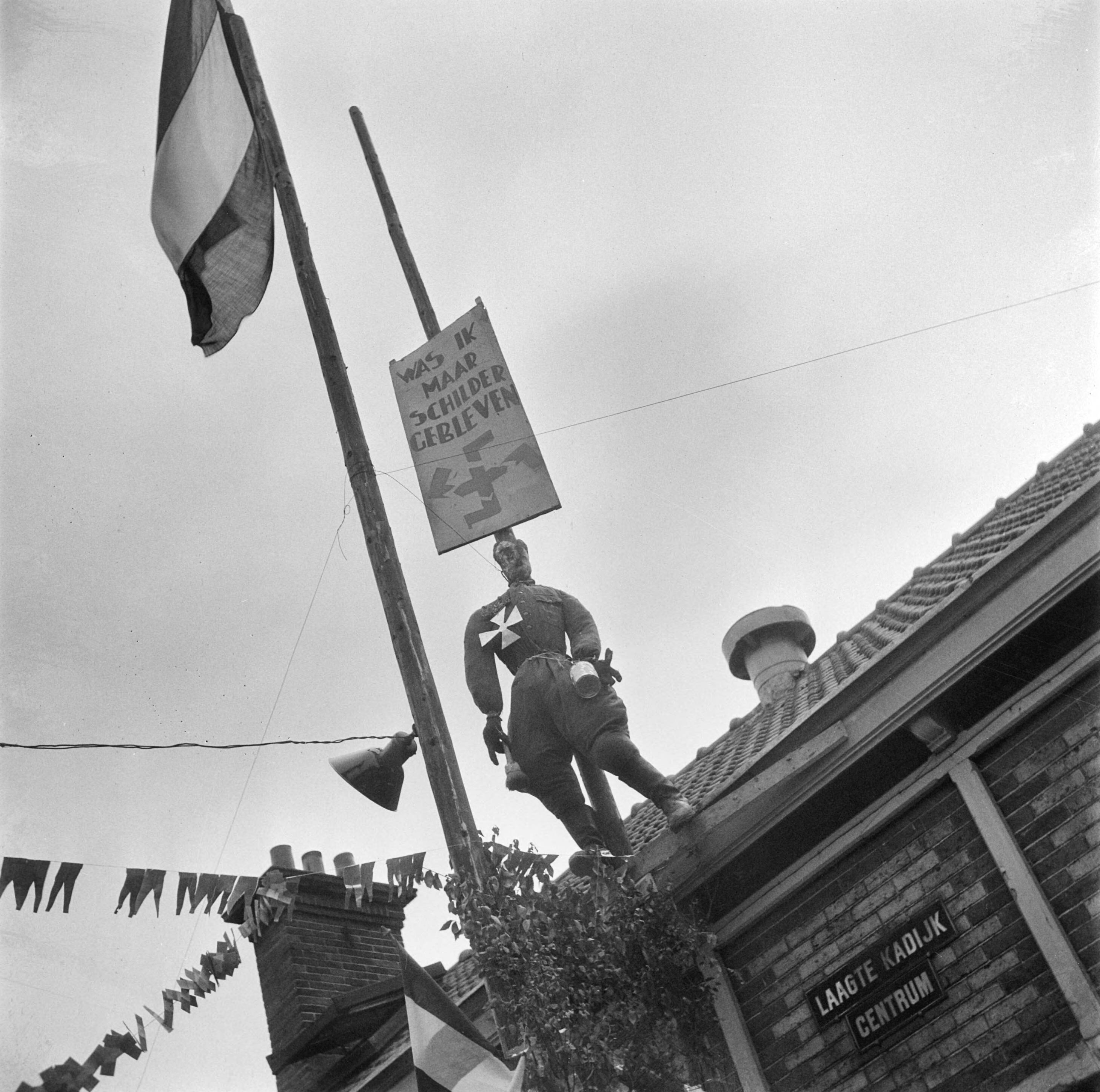 Pop voorstellende Hitler hangt aan een paal met opschrift "was ik maar schilder gebleven. Locatie Laagte Kadijk