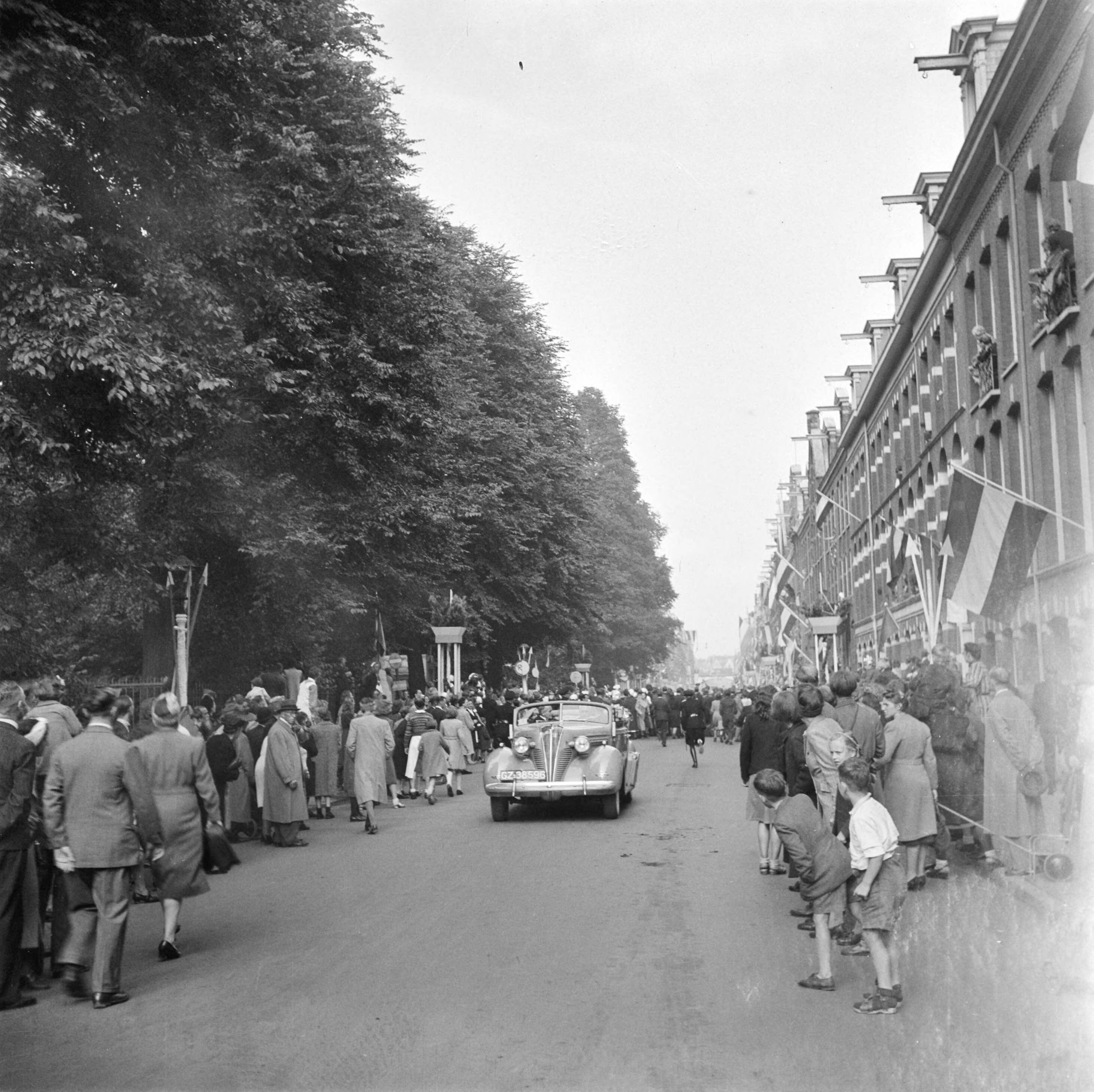 Rijtoer van koningin Wilhelmina. Publiek stroomt toe als de wagen blijkbaar is gestopt. De voorste auto met o.a.