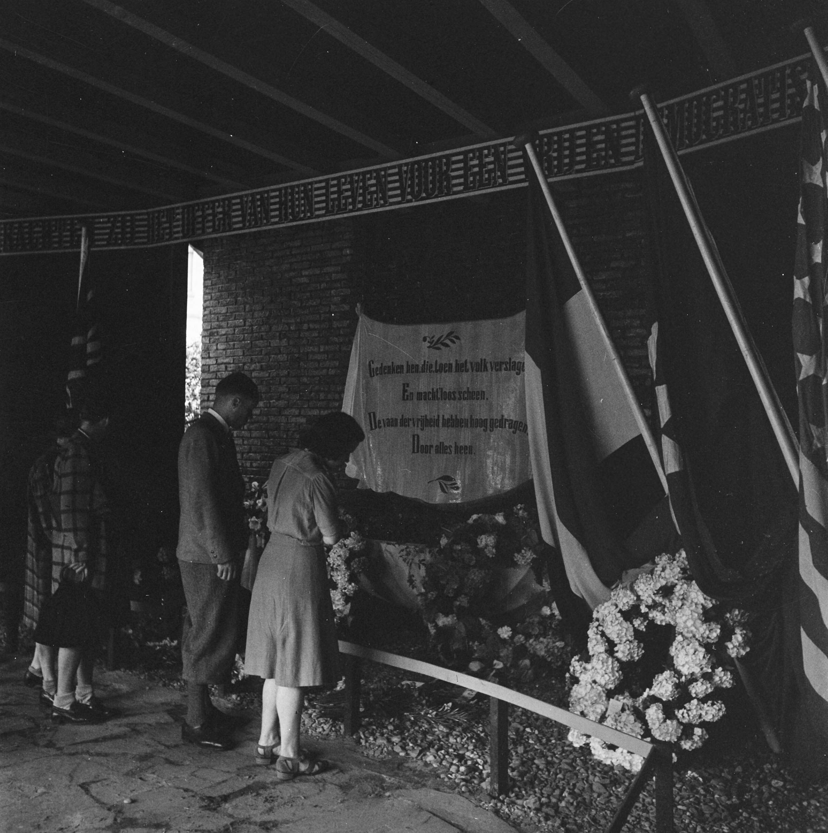 Herdenkingsplaats. Op een doek staat gedrukt "Gedenken hen die toen het volk verslagen en machtloos scheen. De vaan der vrijheid hebben hoog gedragen. Door alles heen"