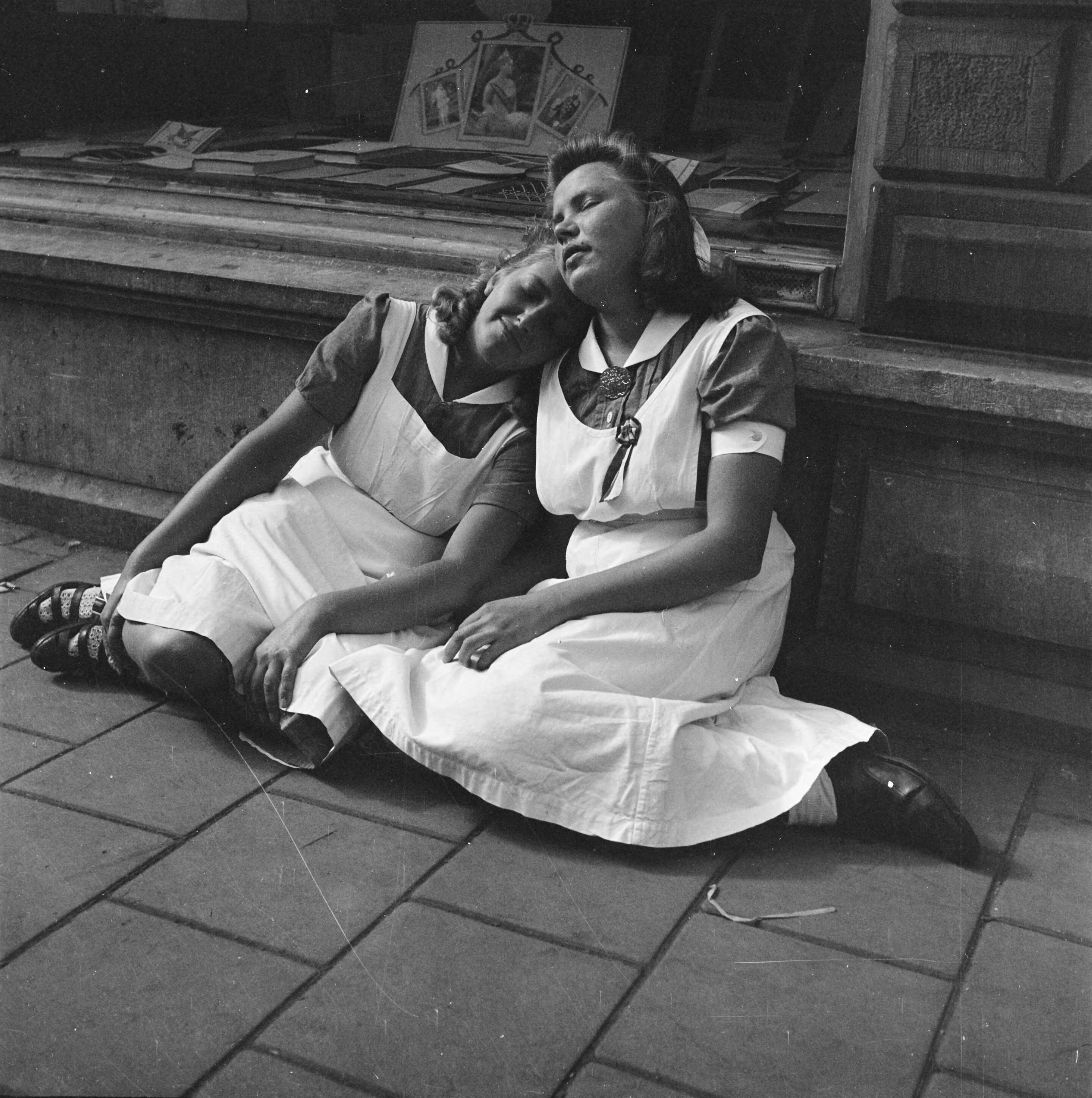 Twee uitgeputte verpleegsters na de uitbundige feestelijkheden