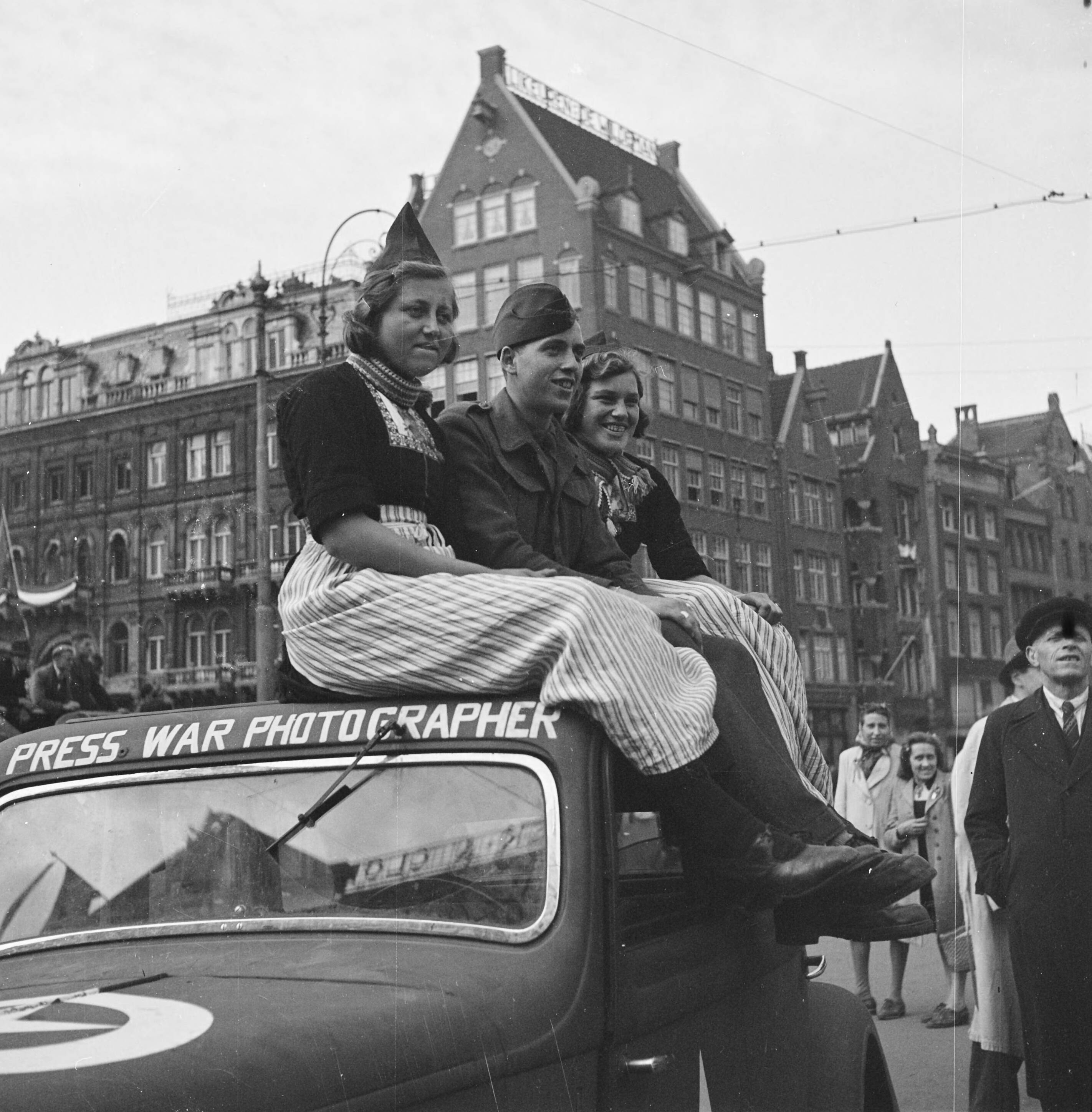 Twee meisjes in Volendammer klederdracht en een militair zitten op het dak van een auto van een oorlogsfotograaf