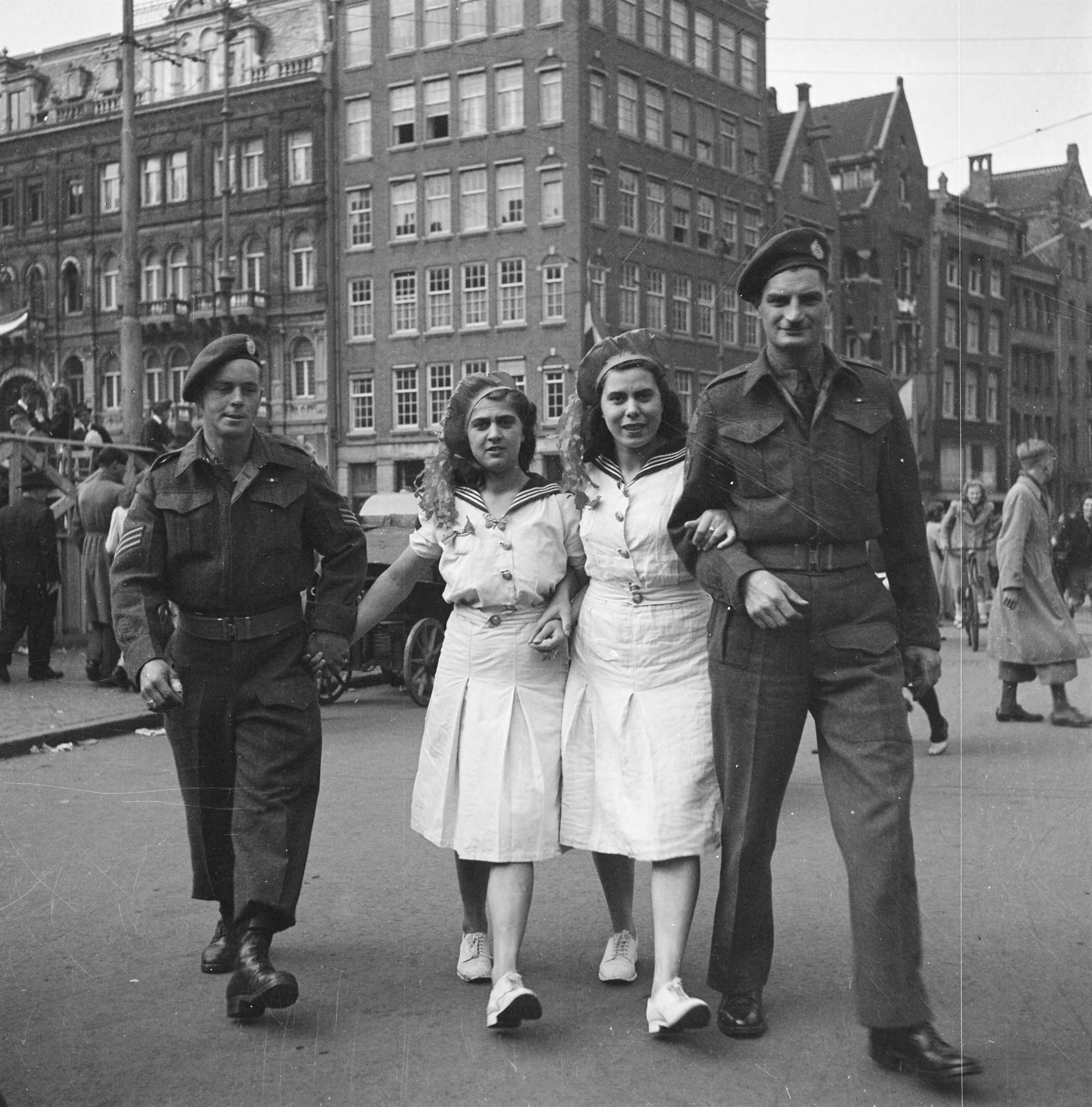 Twee meisjes in matrozenpakjes met twee militairen