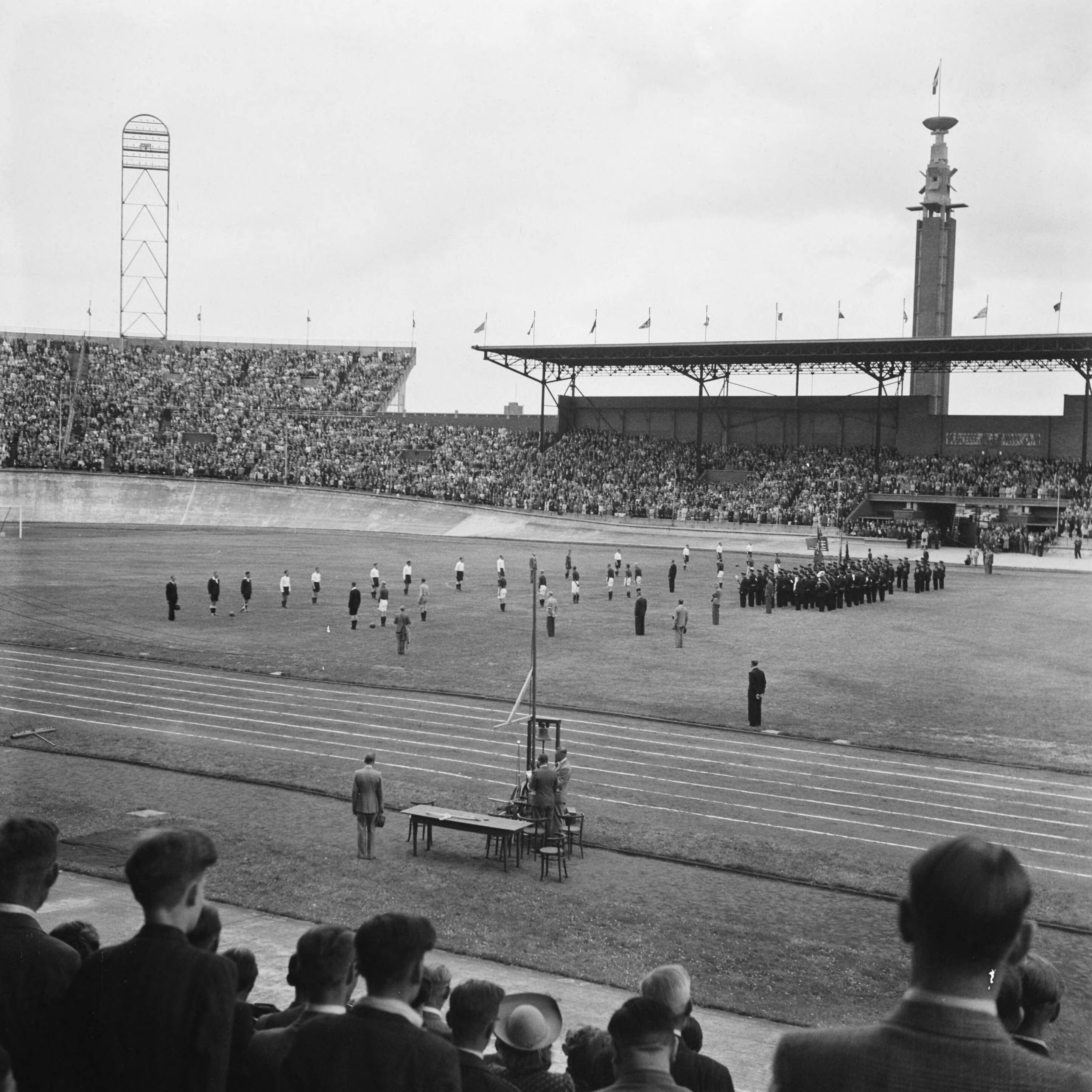 Voetbalspelers staan aangetreden in het Olympisch Stadion. Het volkslied wordt gespeeld