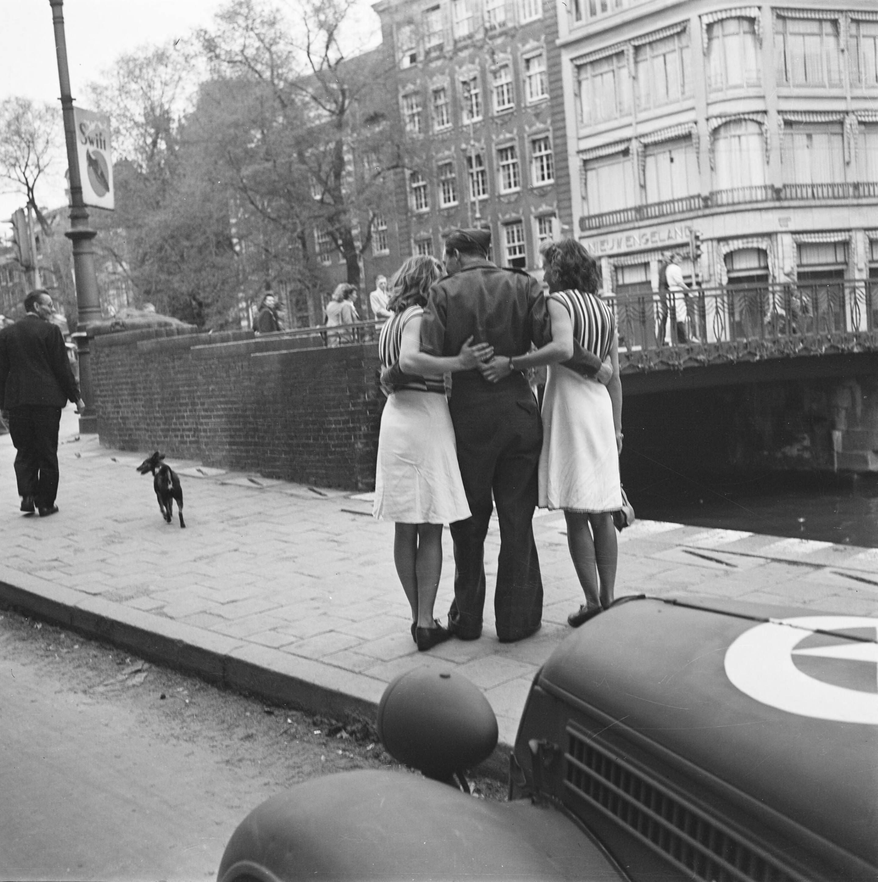 Militair met twee meisjes, gefotografeerd van achteren
