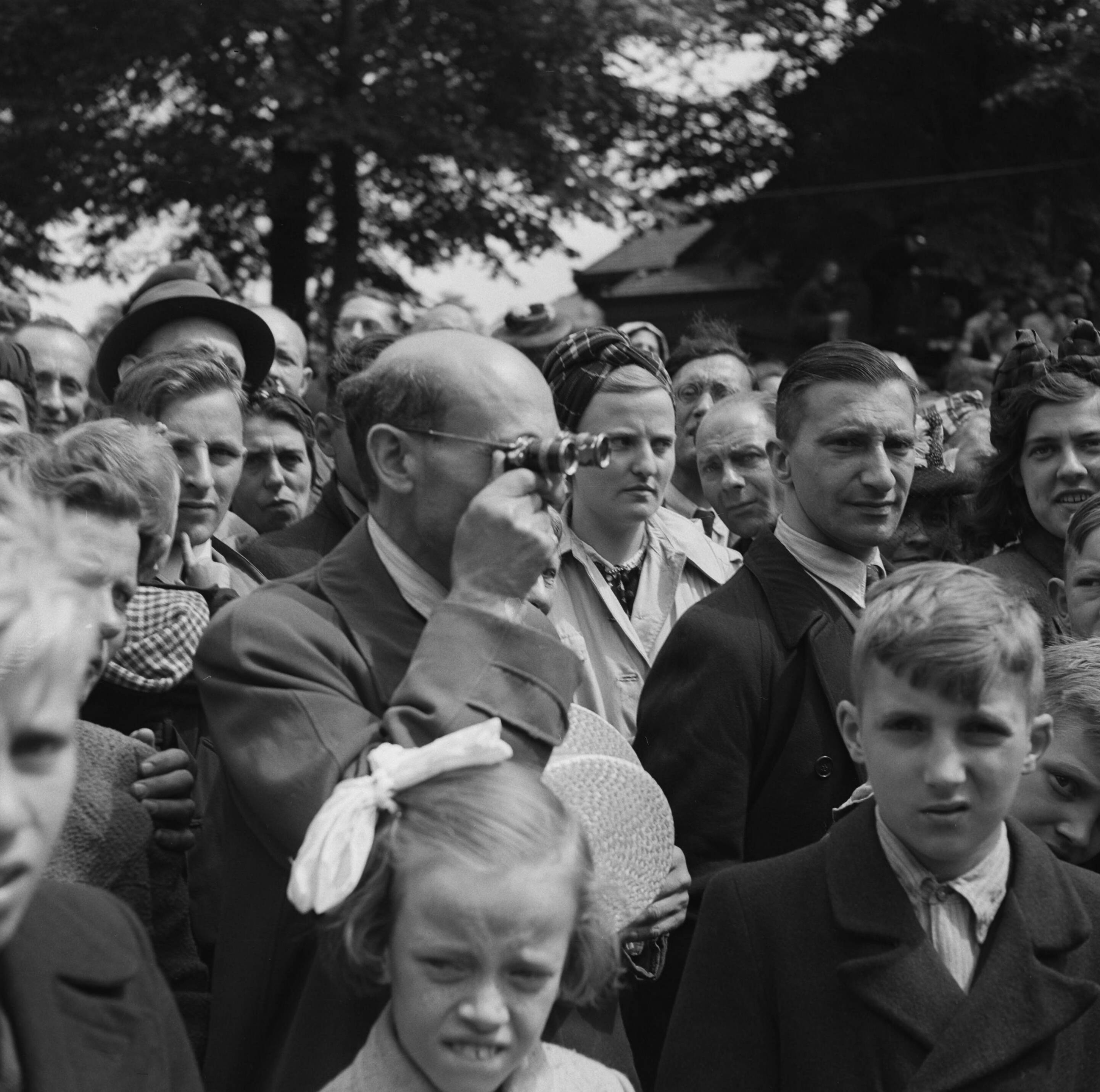 In het publiek gebruikt een man een toneelkijker om beter te kunnen zien