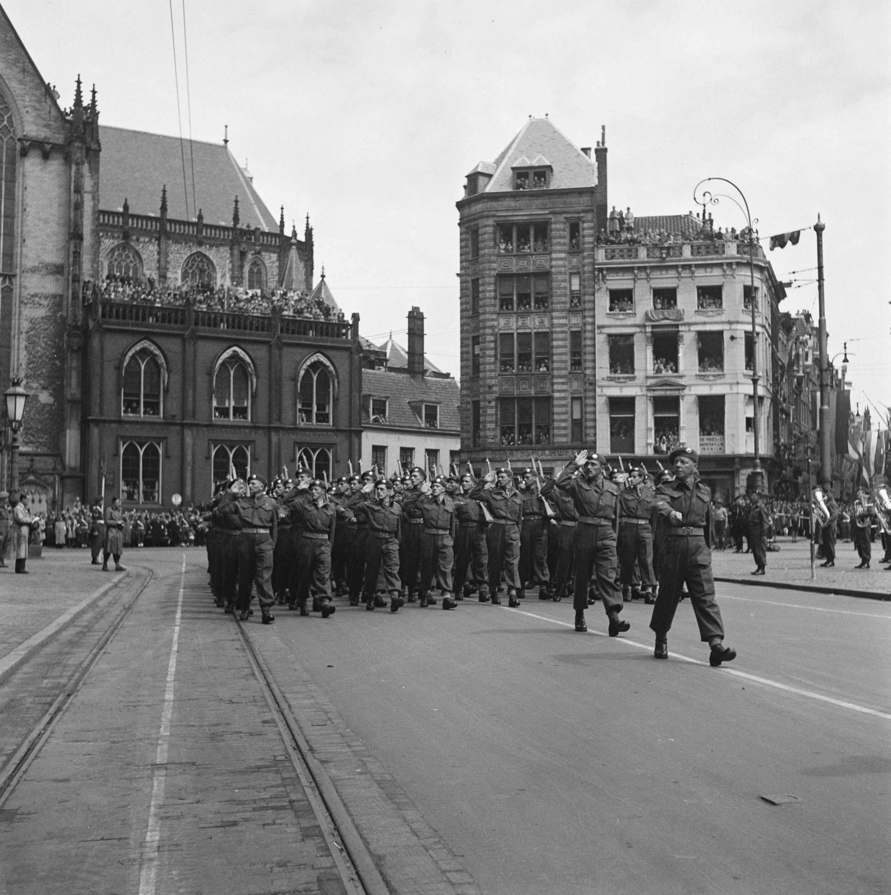 Defilé langs het Paleis op de Dam. Een militaire eenheid brengt een groet