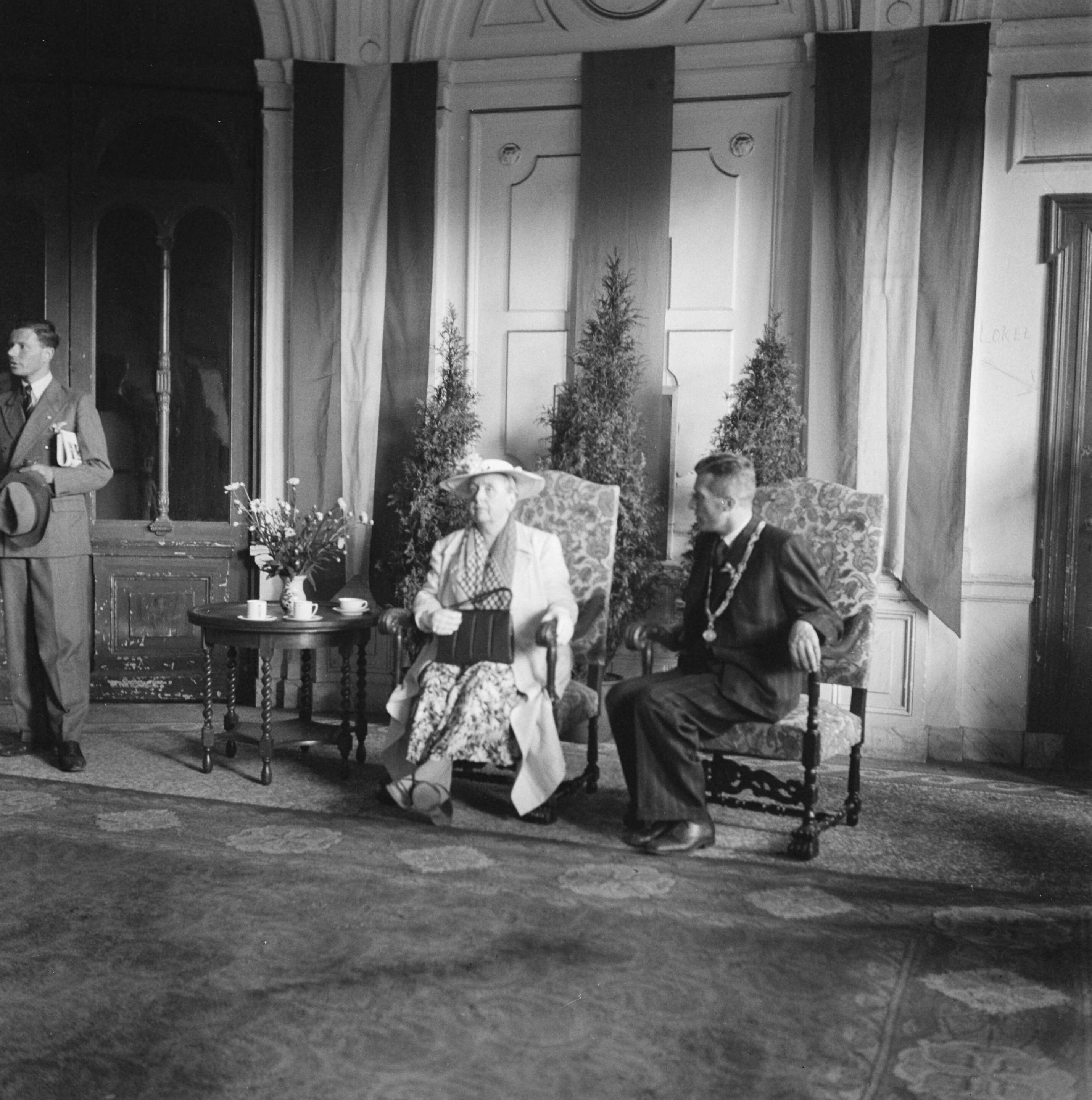De koningin In Sacre Coeur (dat als voorlopig Stadhuis is ingericht), naast haar waarnemend burgemeester C.G. Matser