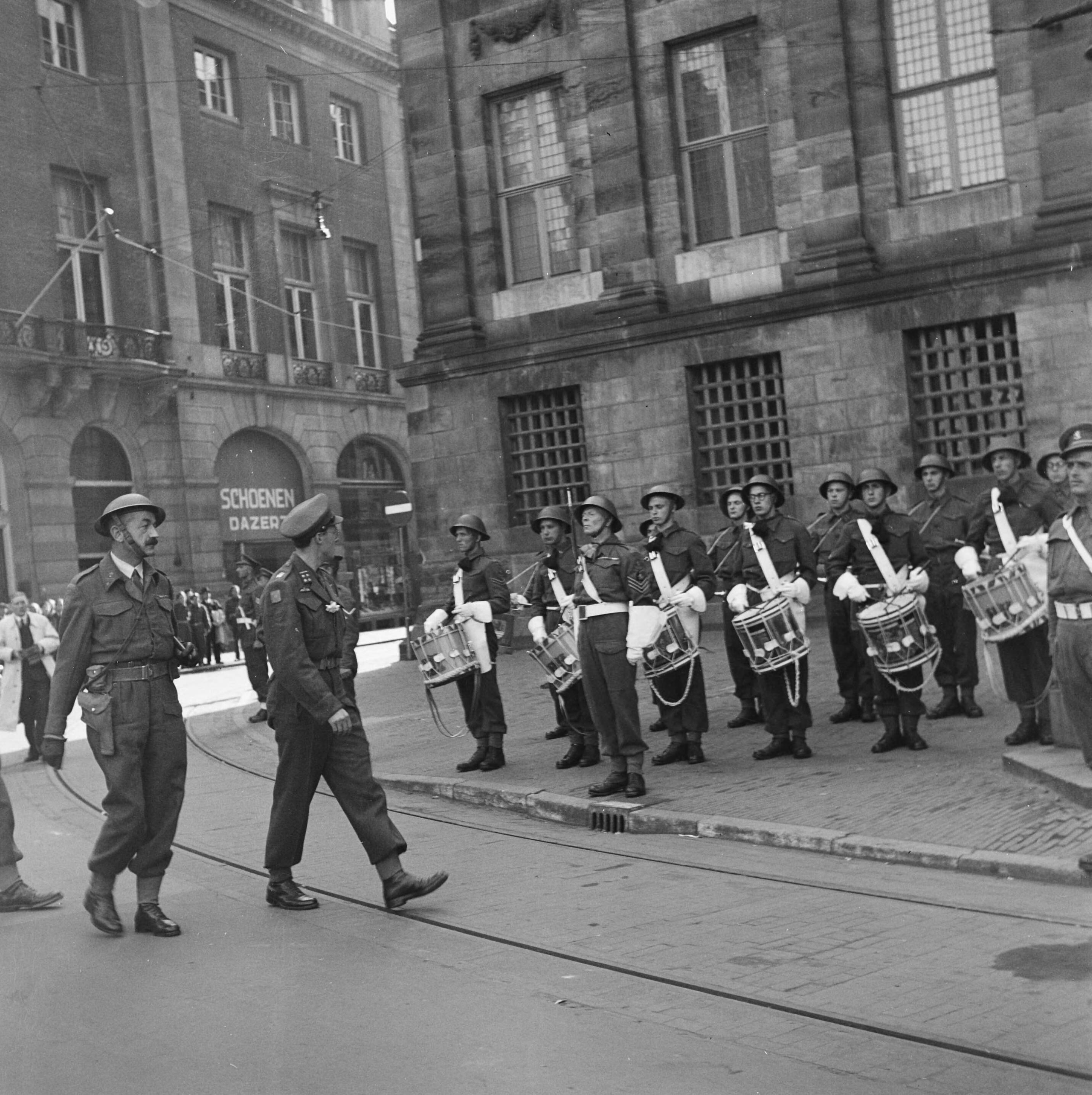 De prins in Amsterdam passeert een militair muziekkorps voor het Paleis op de Dam