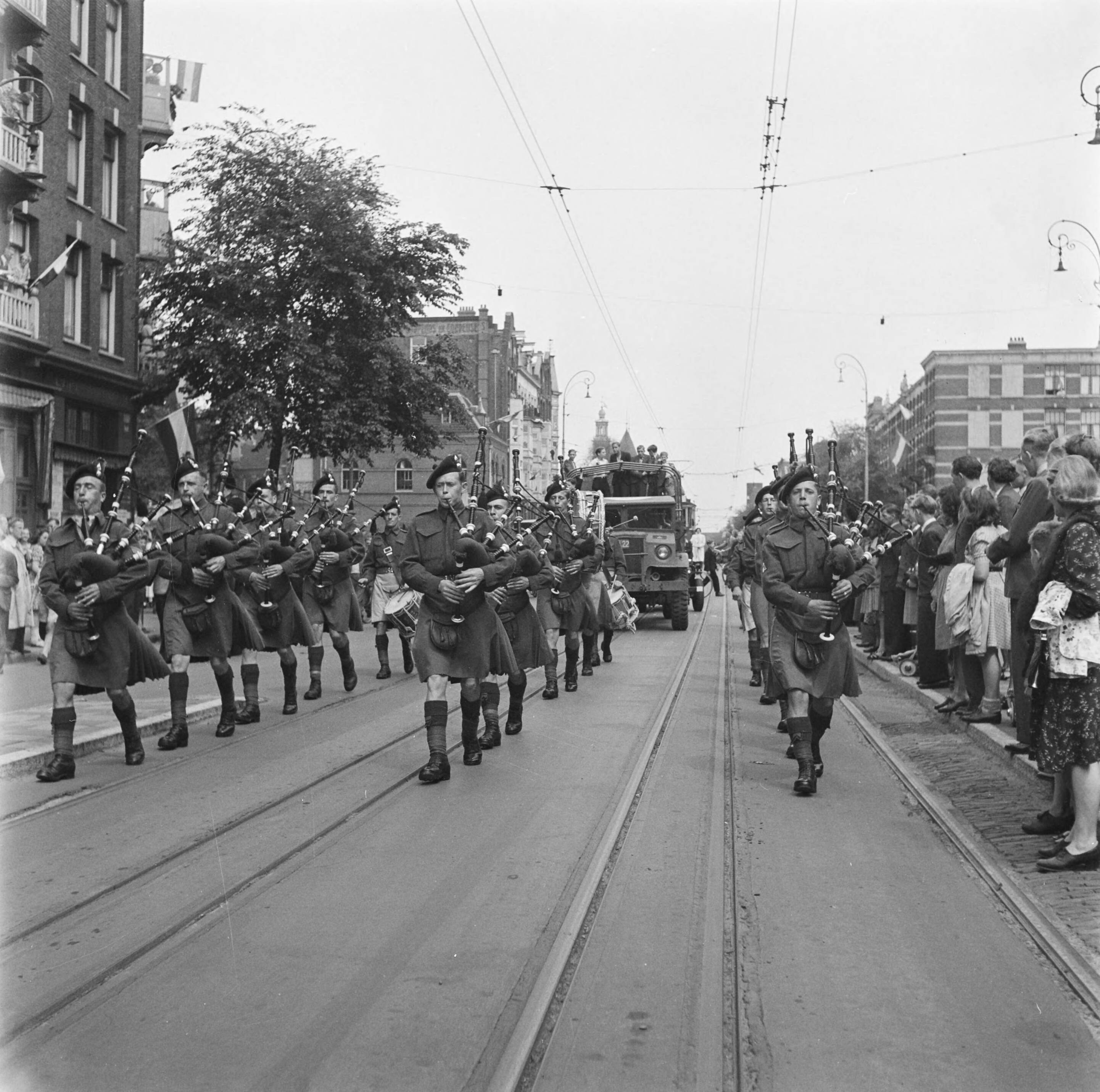 Muziekkorps van het regiment The Seaforth Highlanders of Canada. Doedelzakspelers