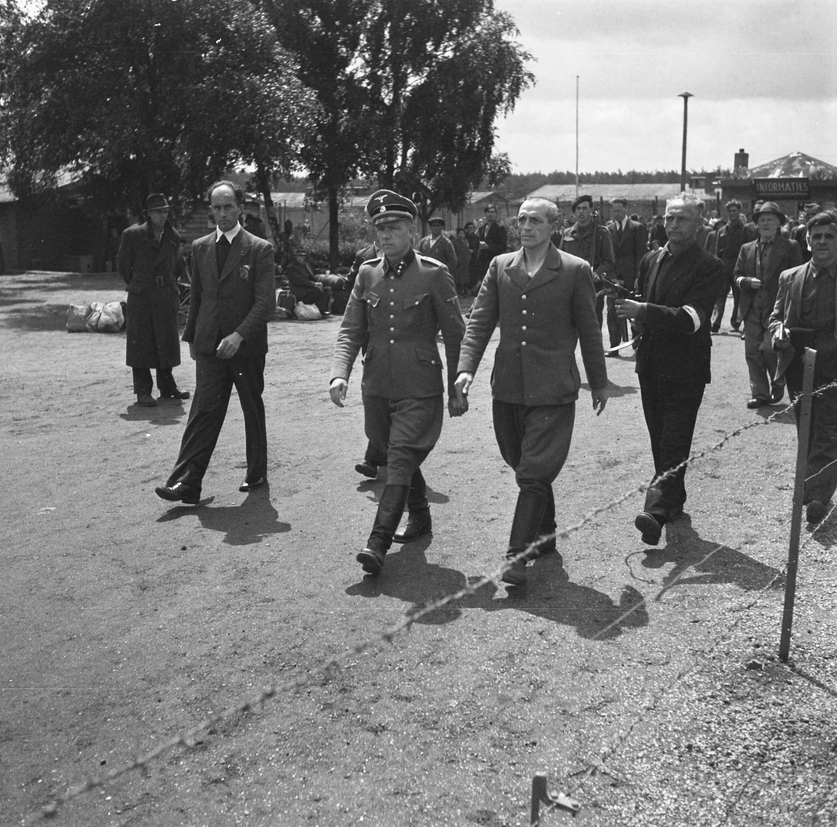 SS-kampbewaker B.J. Westerveld (rechts) en kampcommandant K.P. Berg bewaakt door mannen van de Binnenlandse Strijdkrachten worden door het kamp geleid