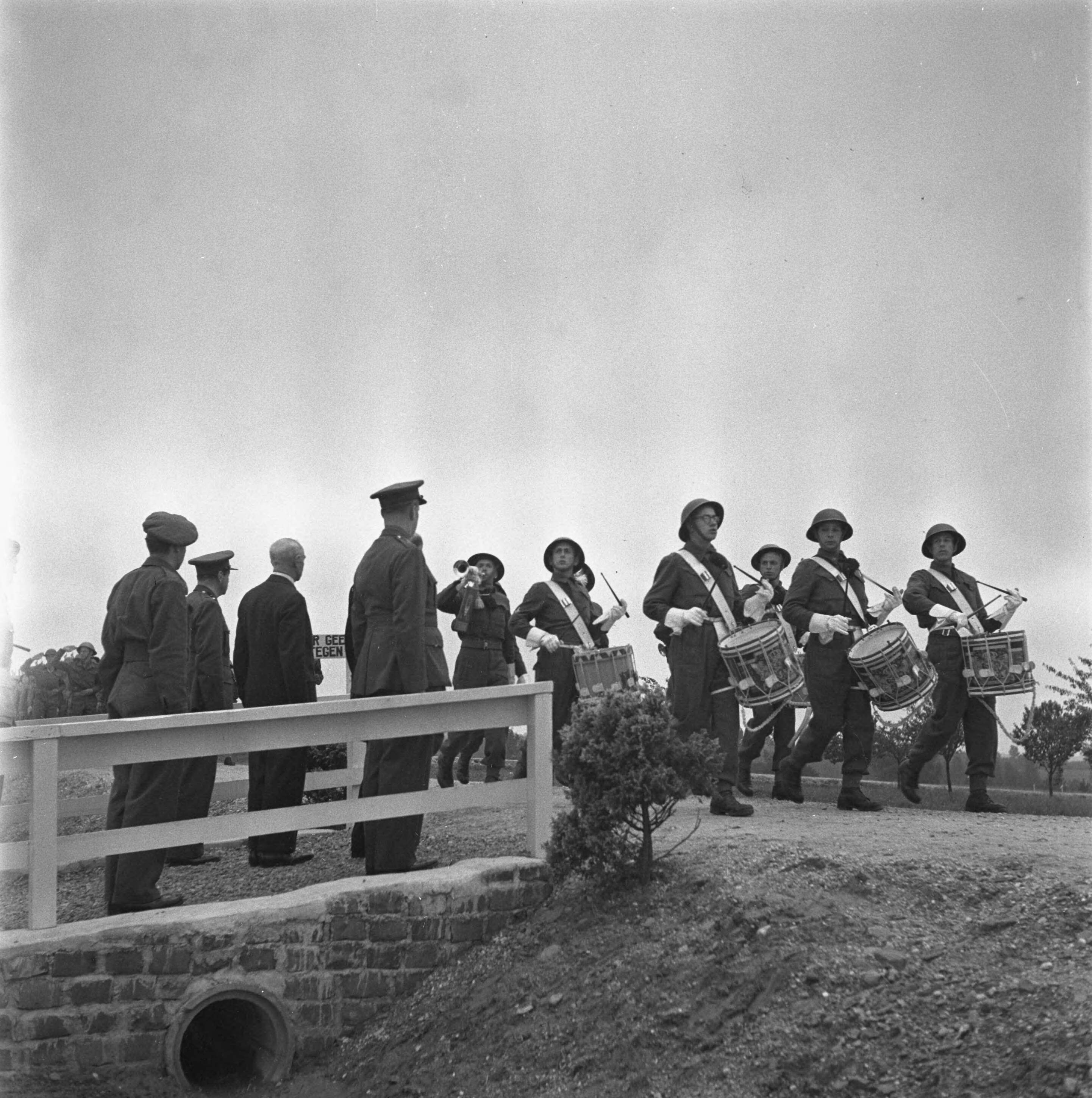 Kranslegging op het soldatenkerkhof Margraten (L.) door minister president Willem Schermerhorn. Trommelaars en trompetters passeren
