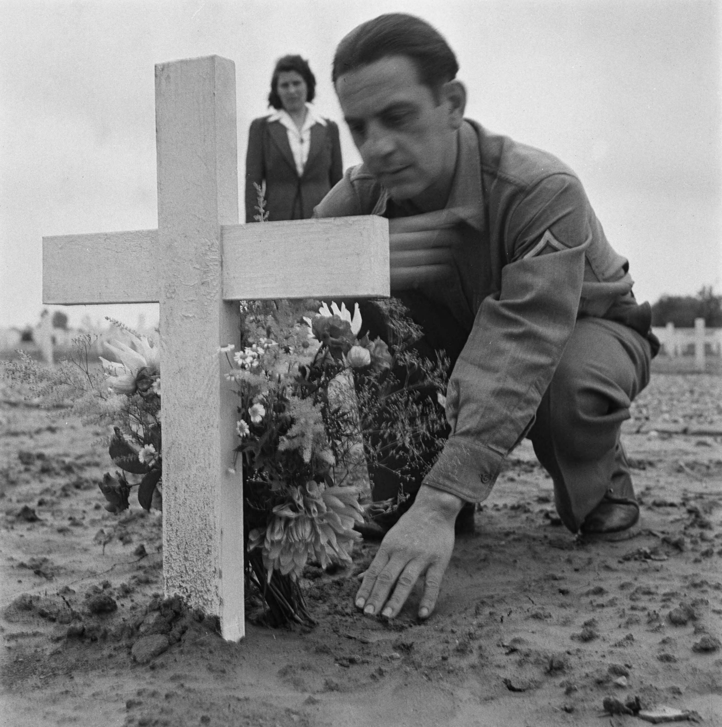 Kranslegging op het soldatenkerkhof Margraten (L.) . Een soldaat plaatst bloemen bij een graf