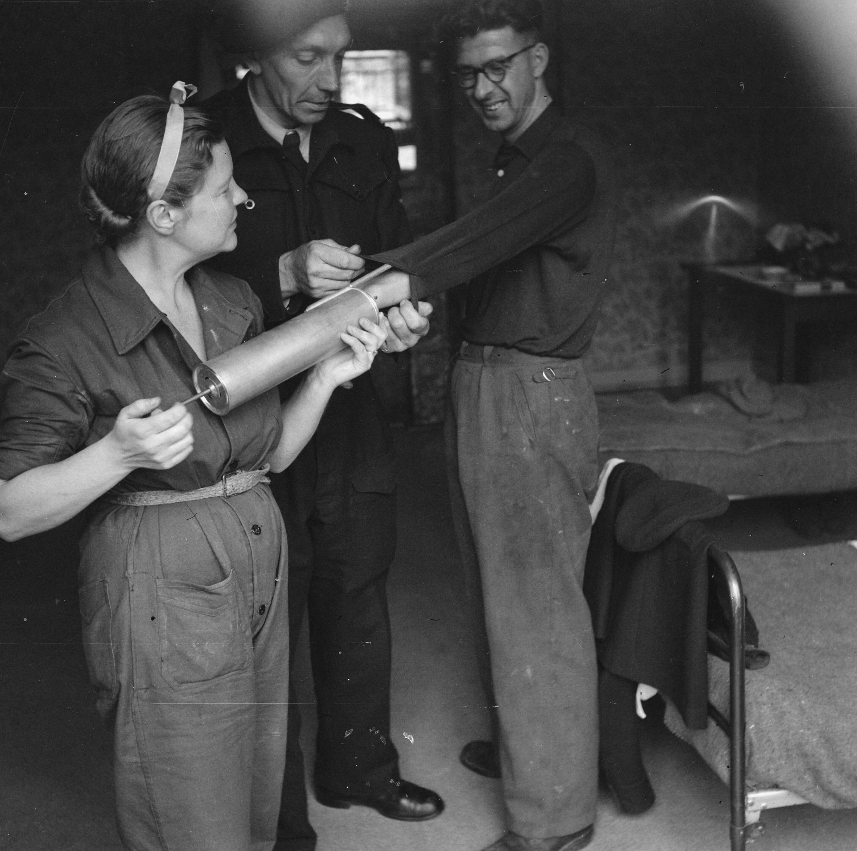 Vrouw hanteert de flitsspuit geholpen door een man van het Nederlandse Rode Kruis Hulpkorps