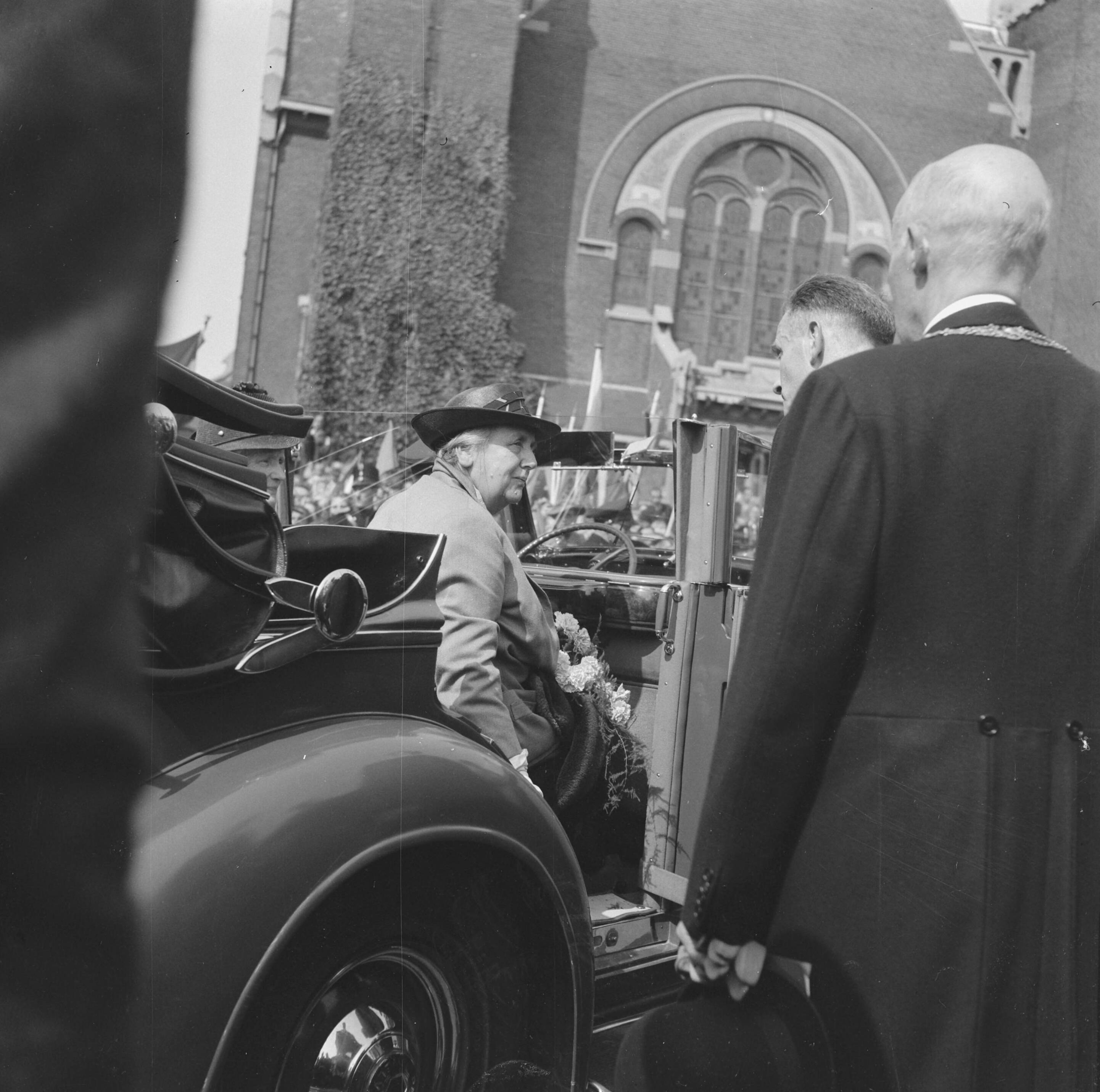 Koningin Wilhelmina wordt opgewacht door burgemeester De Monchy