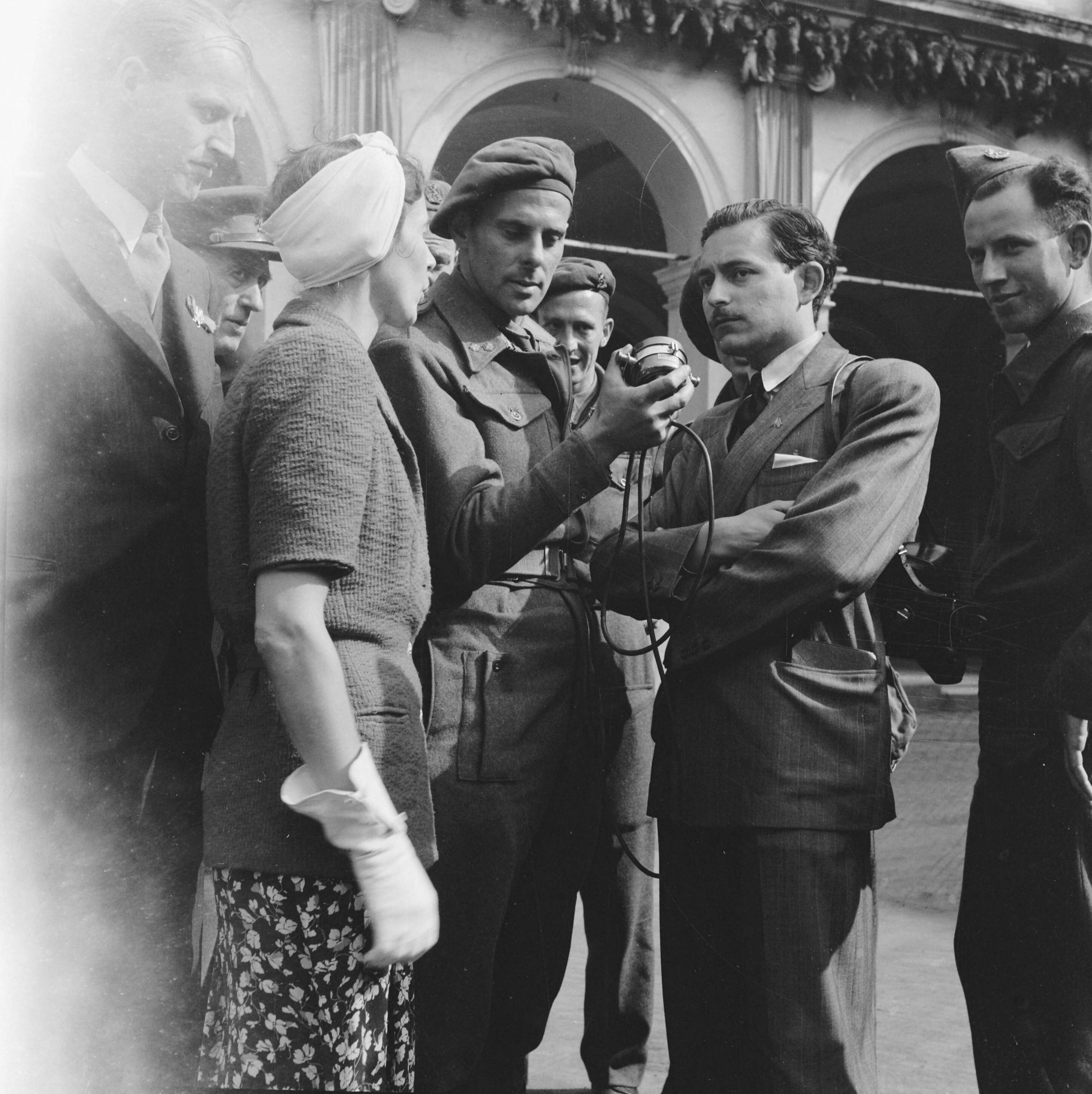 Man in burger wordt geinterviewd door militaire radioverslaggever. Bij hem staat een vrouw