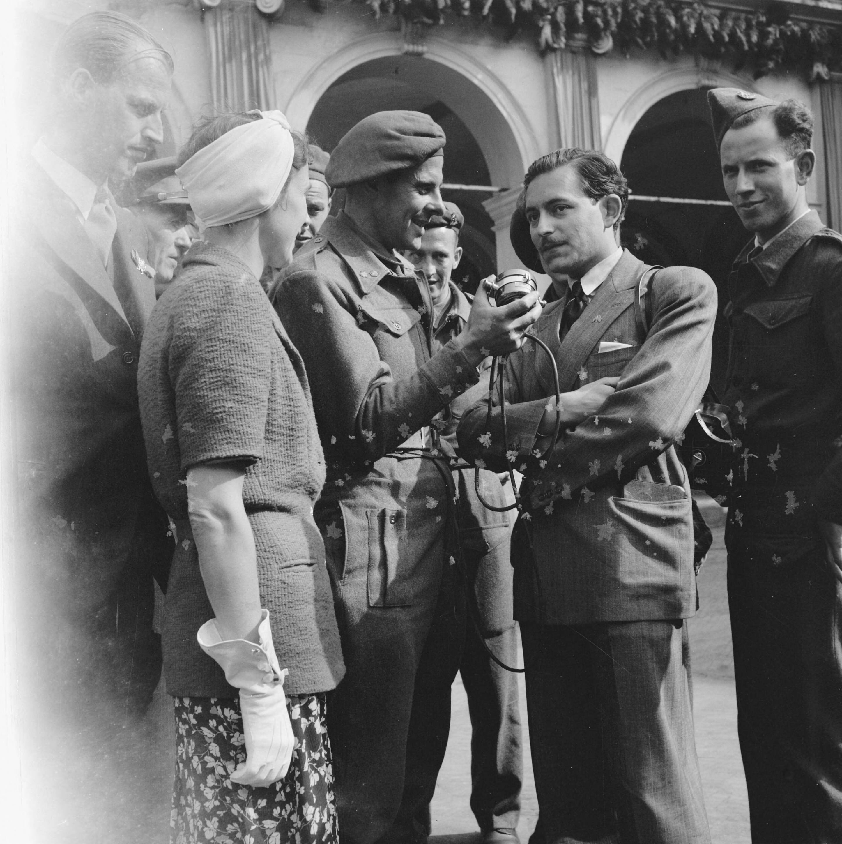 Man in burger wordt geinterviewd door militaire radioverslaggever. Bij hem staat een vrouw