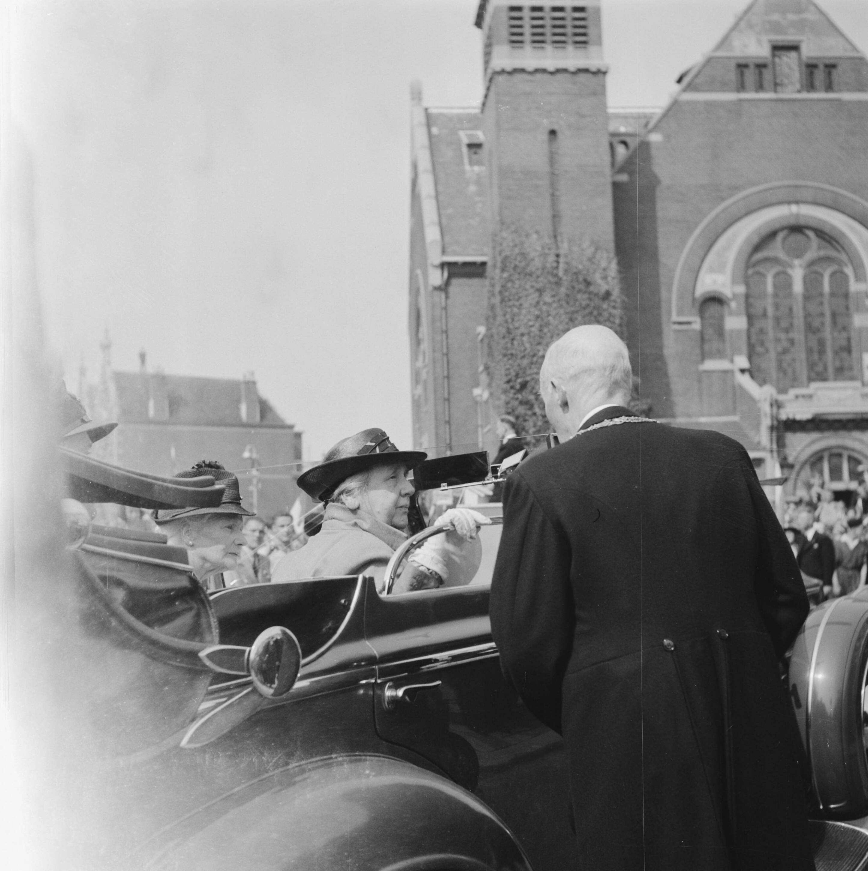 Koningin Wilhelmina terug in Den Haag. Zij wordt begroet door burgemeester De Monchy
