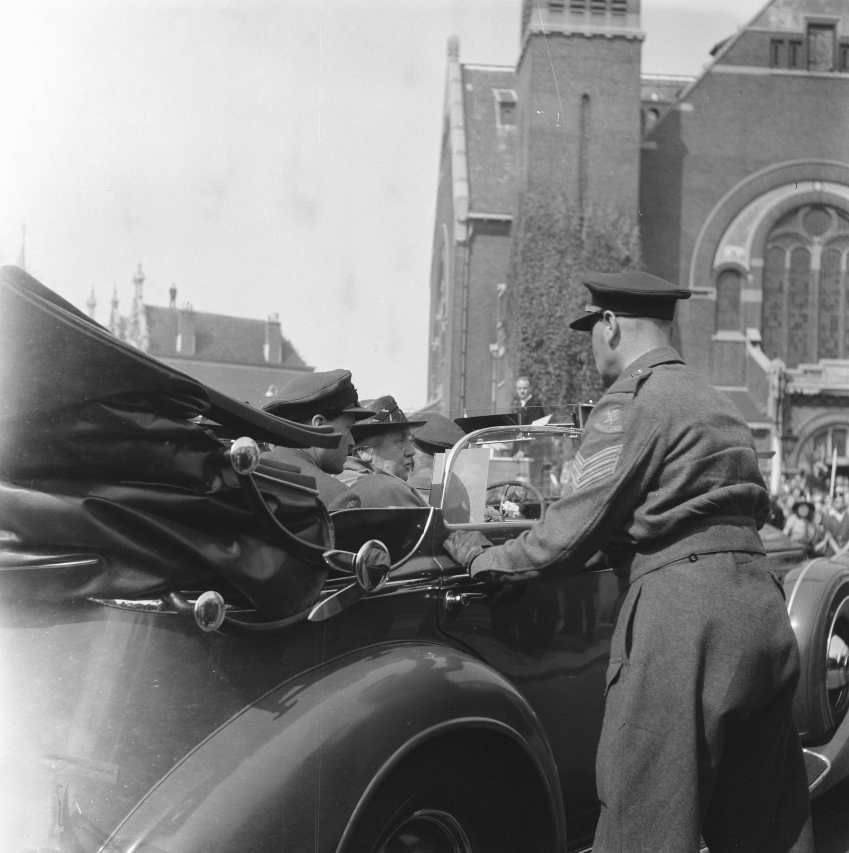 Koningin Wilhelmina in haar auto. Deur wordt geopend door sergeant
