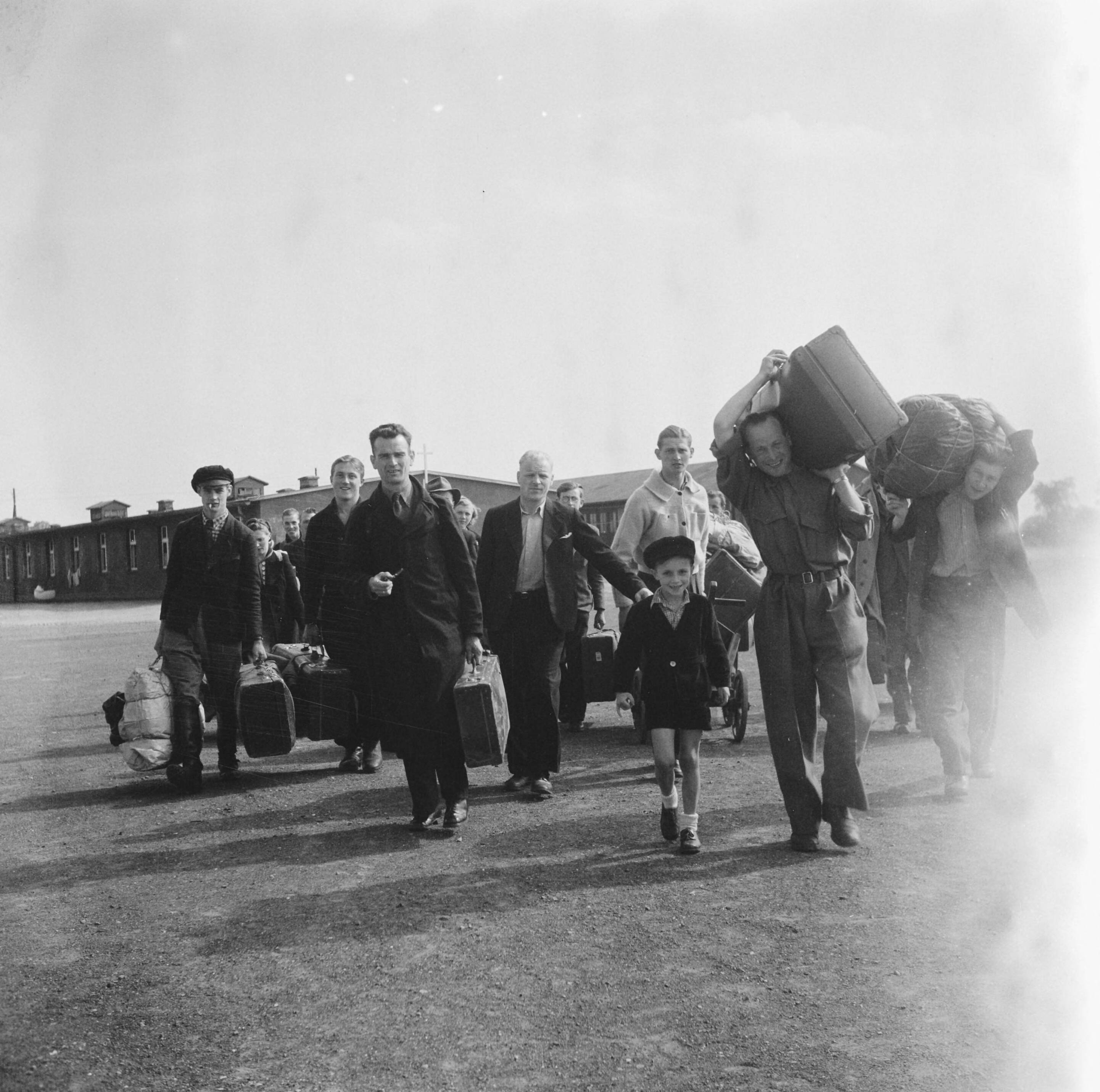 Repatrianten met bagage. Een kleine jongen in het gezelschap