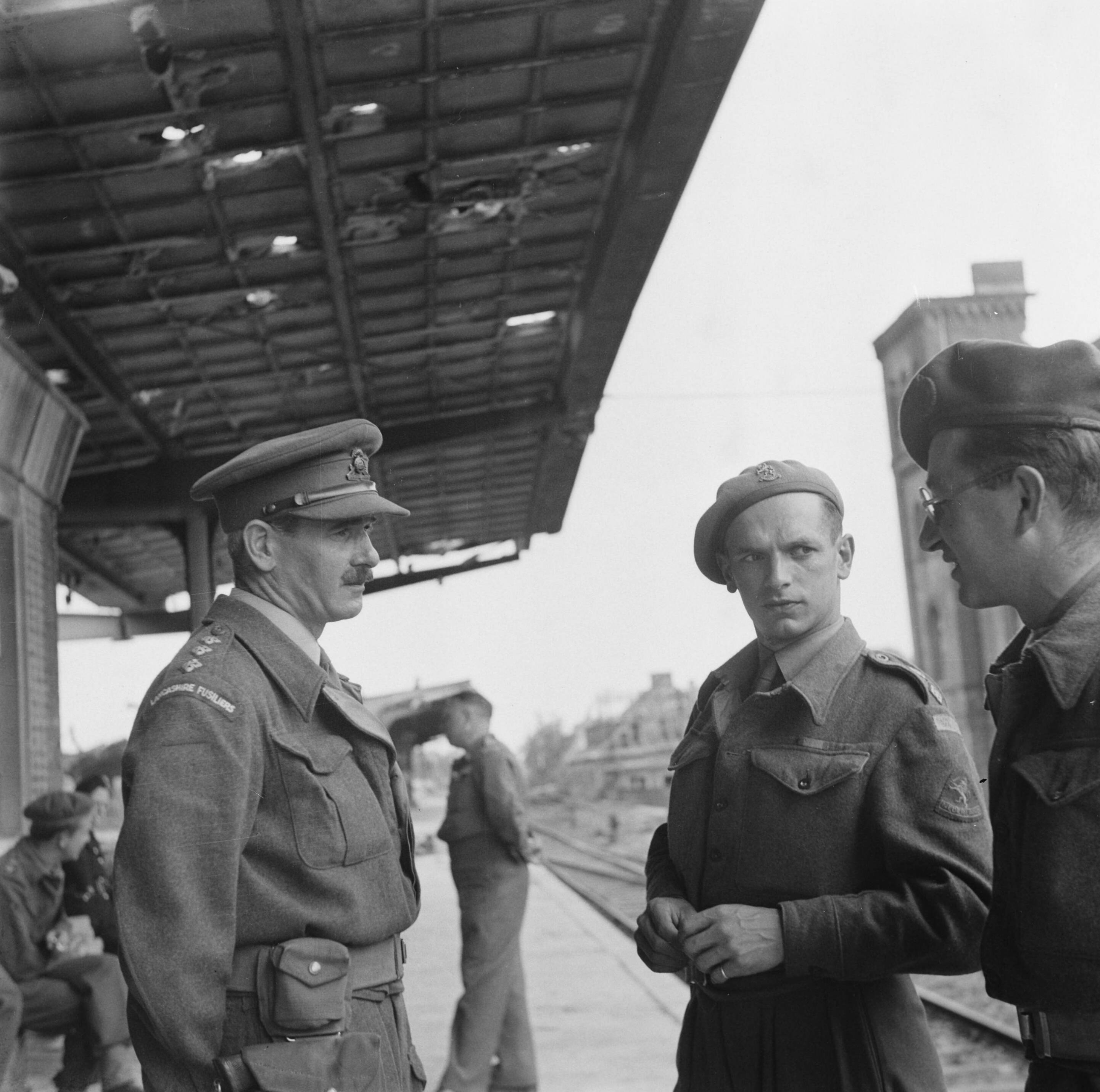 Militairen in gesprek op een spoorwegstation. Links een kapitein van de Lancashire Fusiliers. In het midden een man in uniform met Engelse rangonderscheidingstekens maar een Nederlands mouwembleem (Je Maintiendrai)