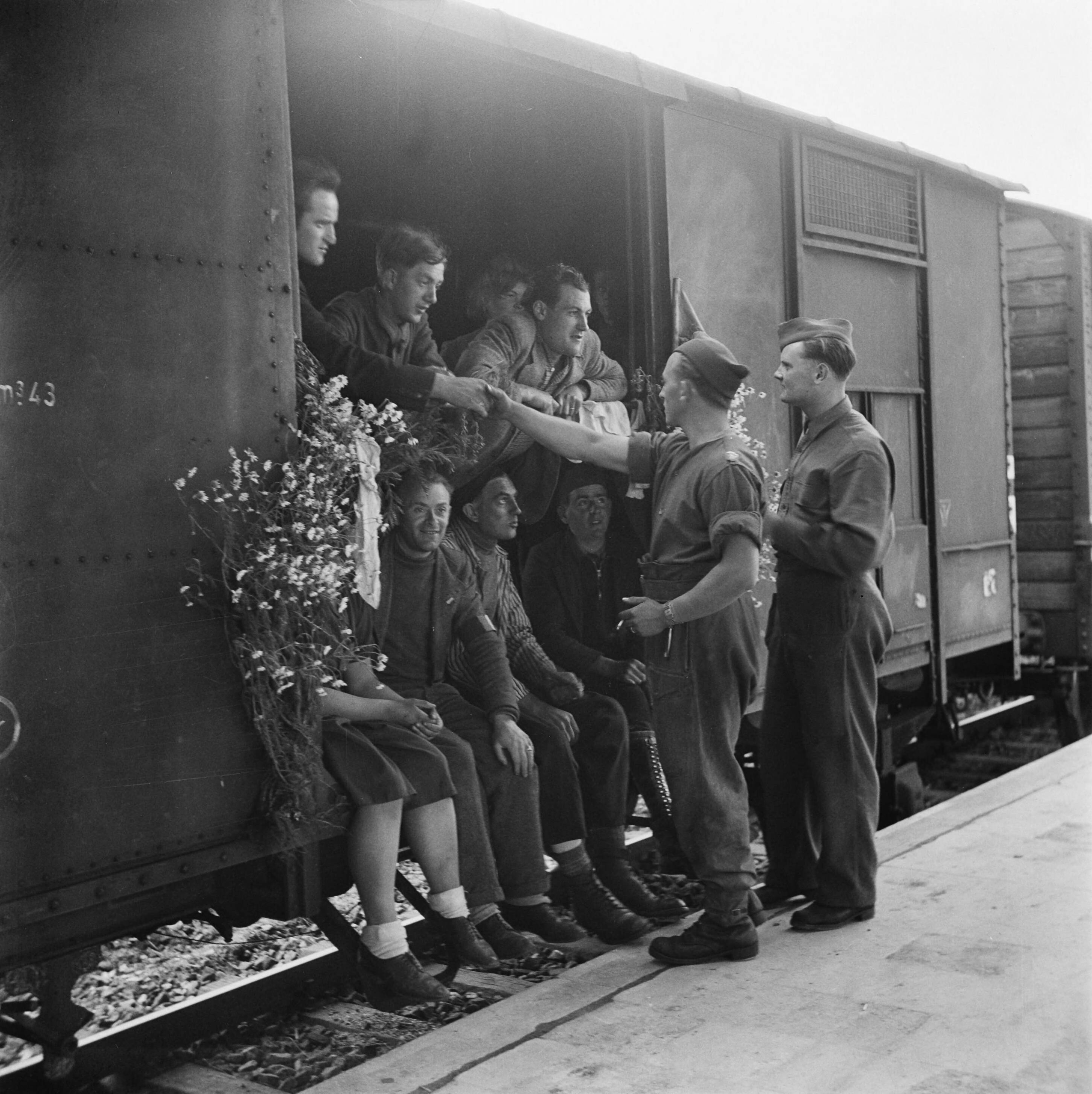Militairen nemen afscheid van een aantal mannen in een goederenwagon. De deuropening is versier met bloemen