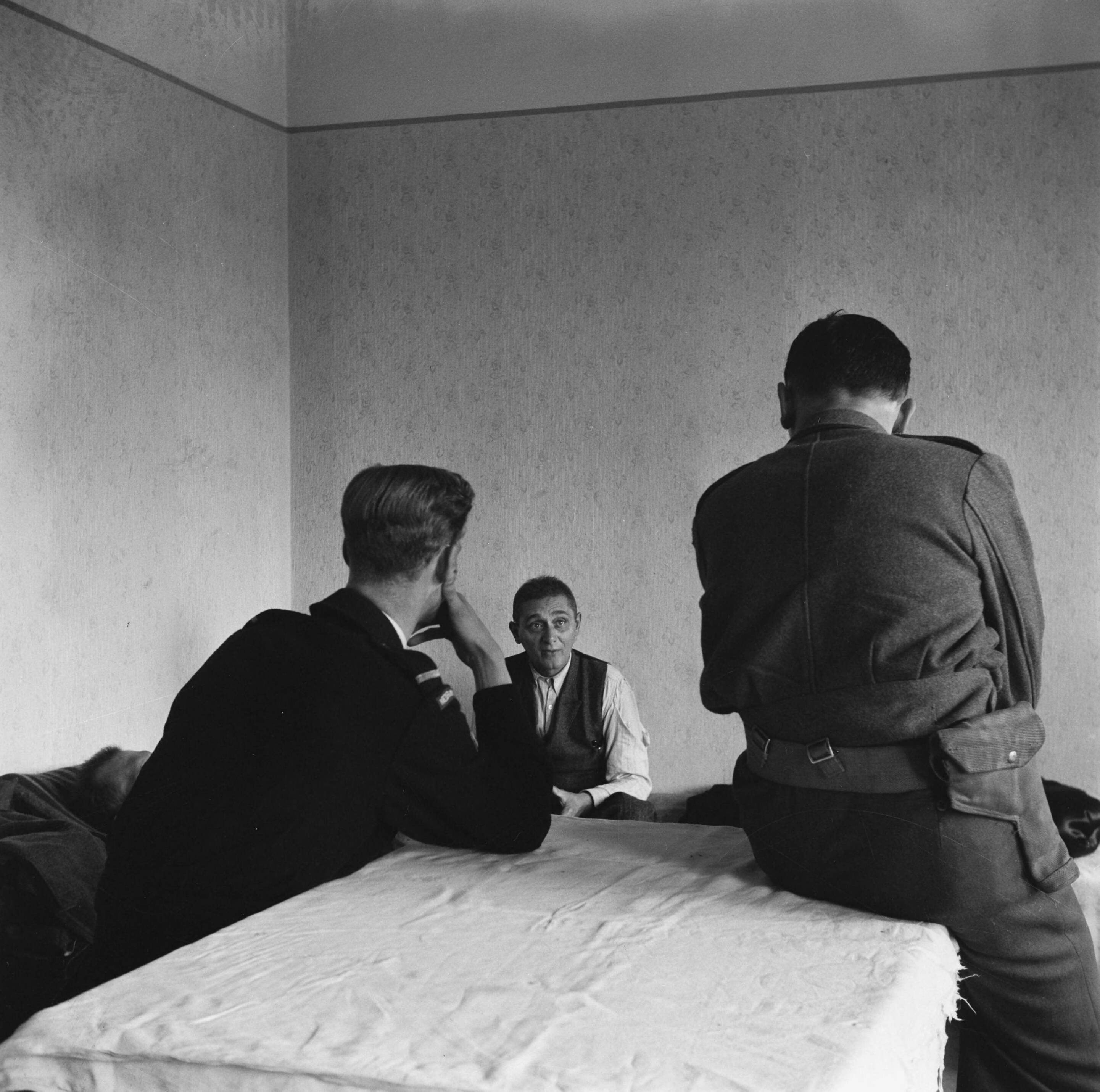 Een repatriant op een veldbed. Op de rug gezien een Nederlandse arts en militair