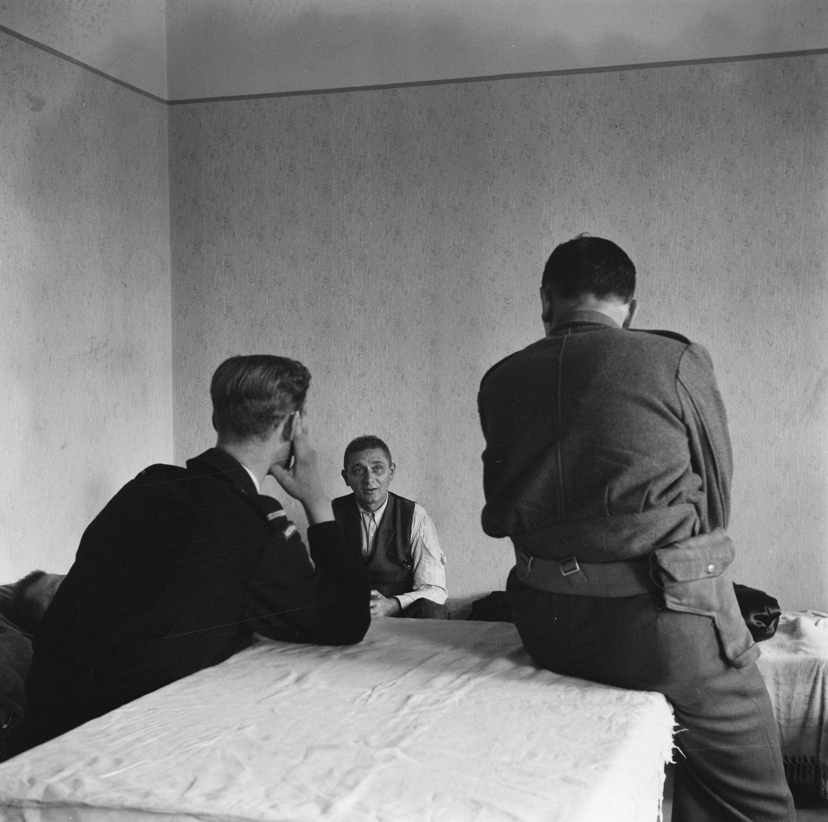 Een repatriant op een veldbed. Op de rug gezien een Nederlandse arts en militair