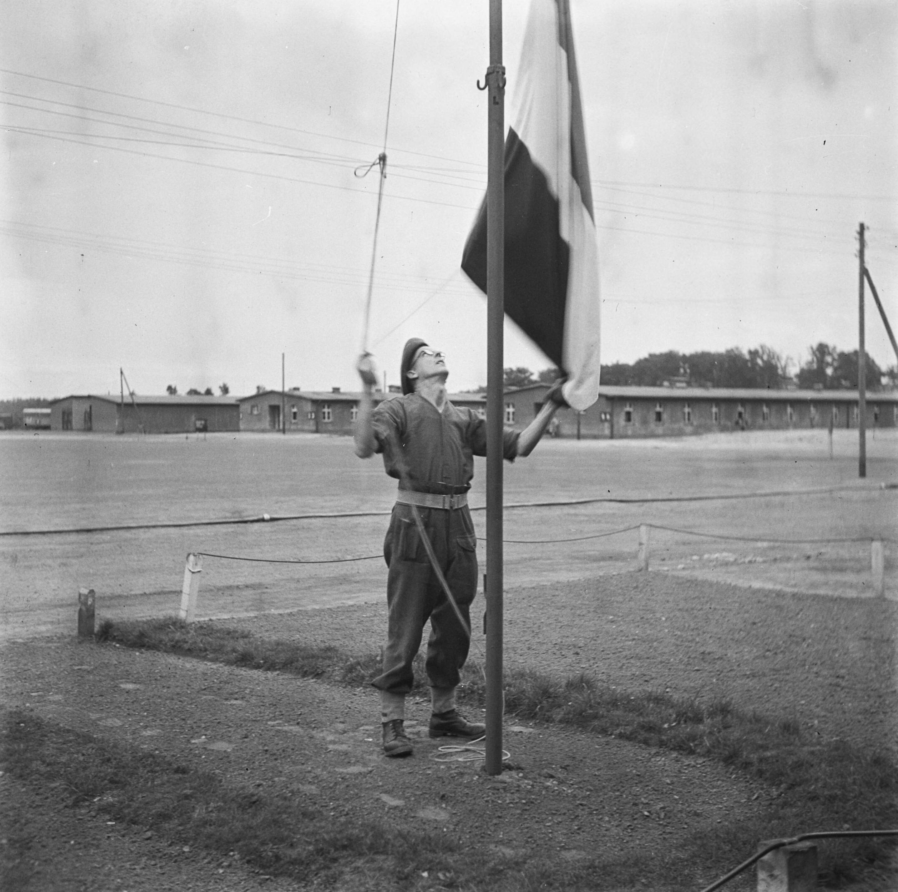 Een soldaat is bezig met het hijsen van een vlag aan een vlaggemast