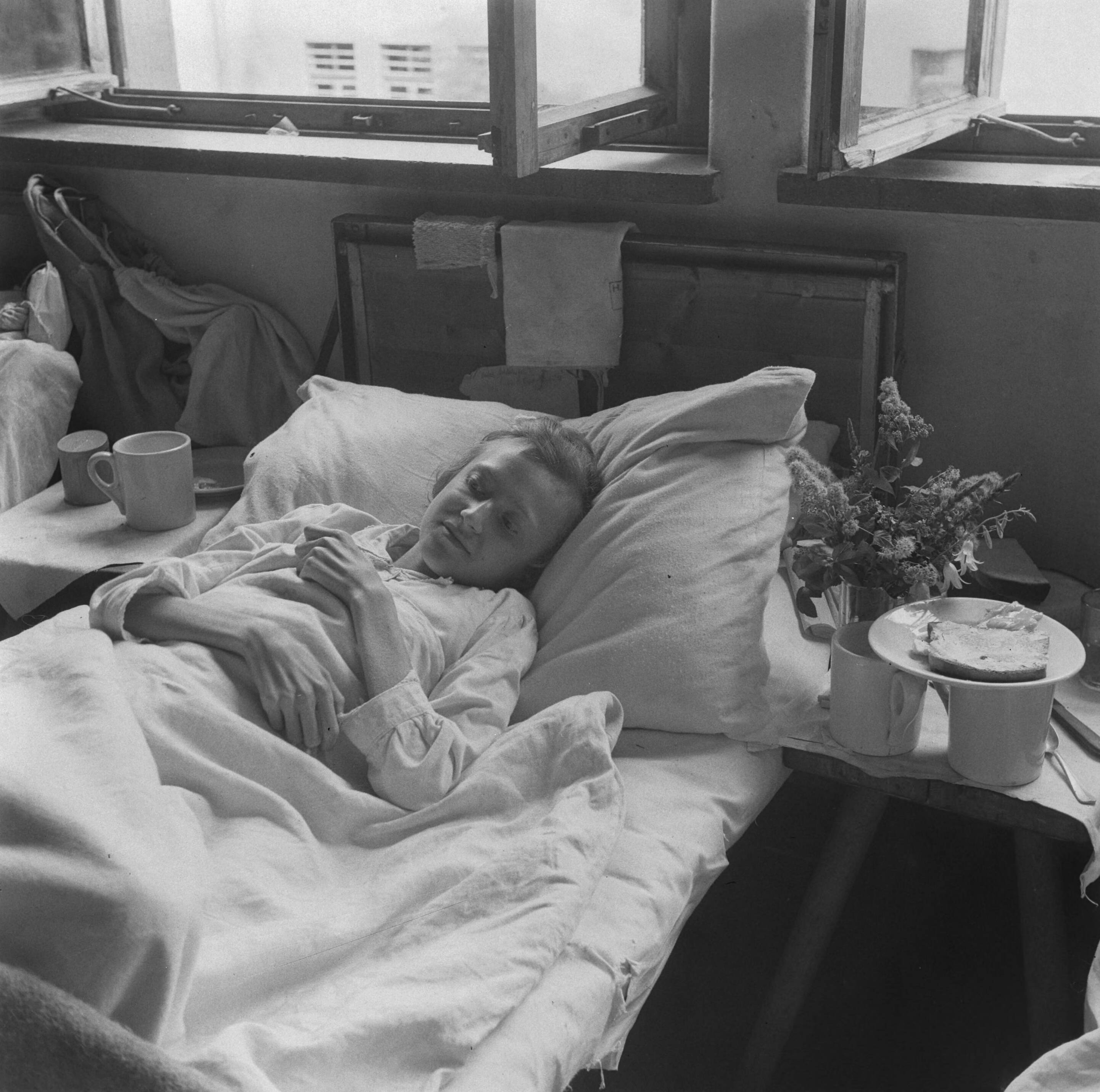 Vrouw ligt op bed met naast haar drinkbekers en een bord met brood