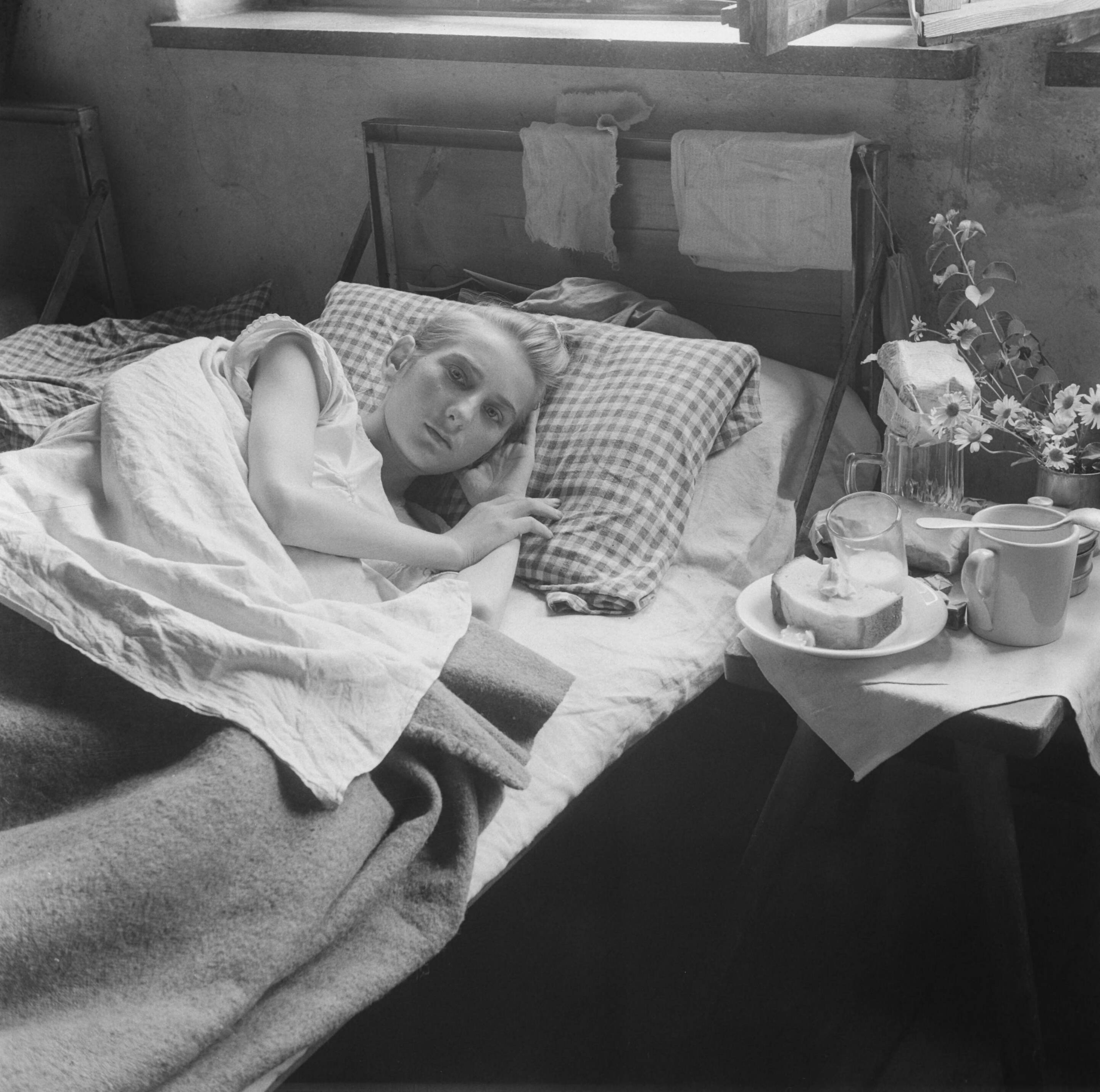 Vrouw ligt op bed met naast haar drinkbekers en een bord met brood
