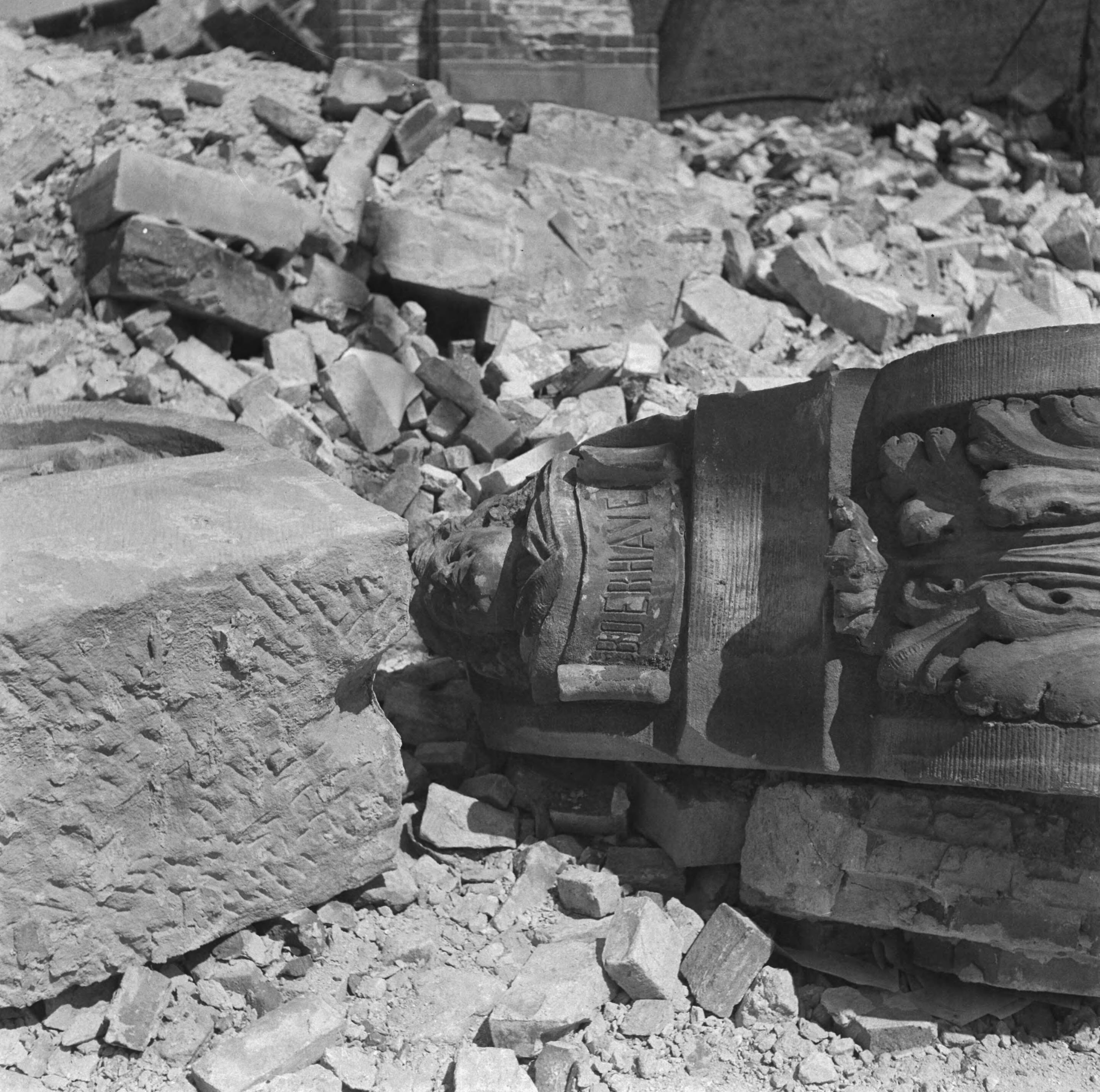 Ornament - beeldhouwwerk van Boerhave- temidden van puin