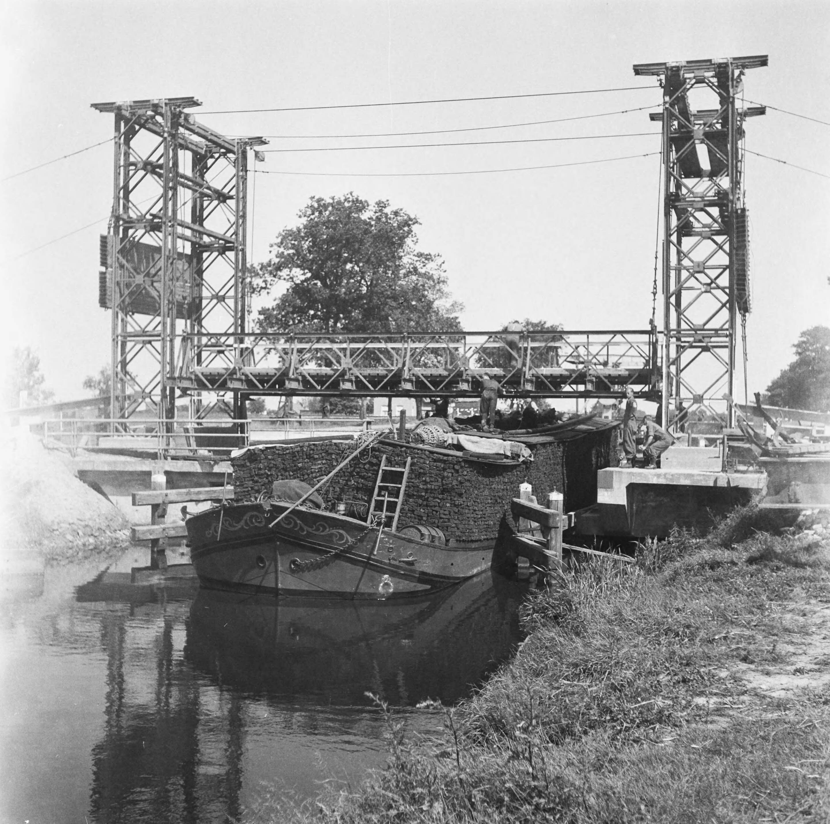 Binnenvaartschip met turf geladen vaart onder een hefbrug door