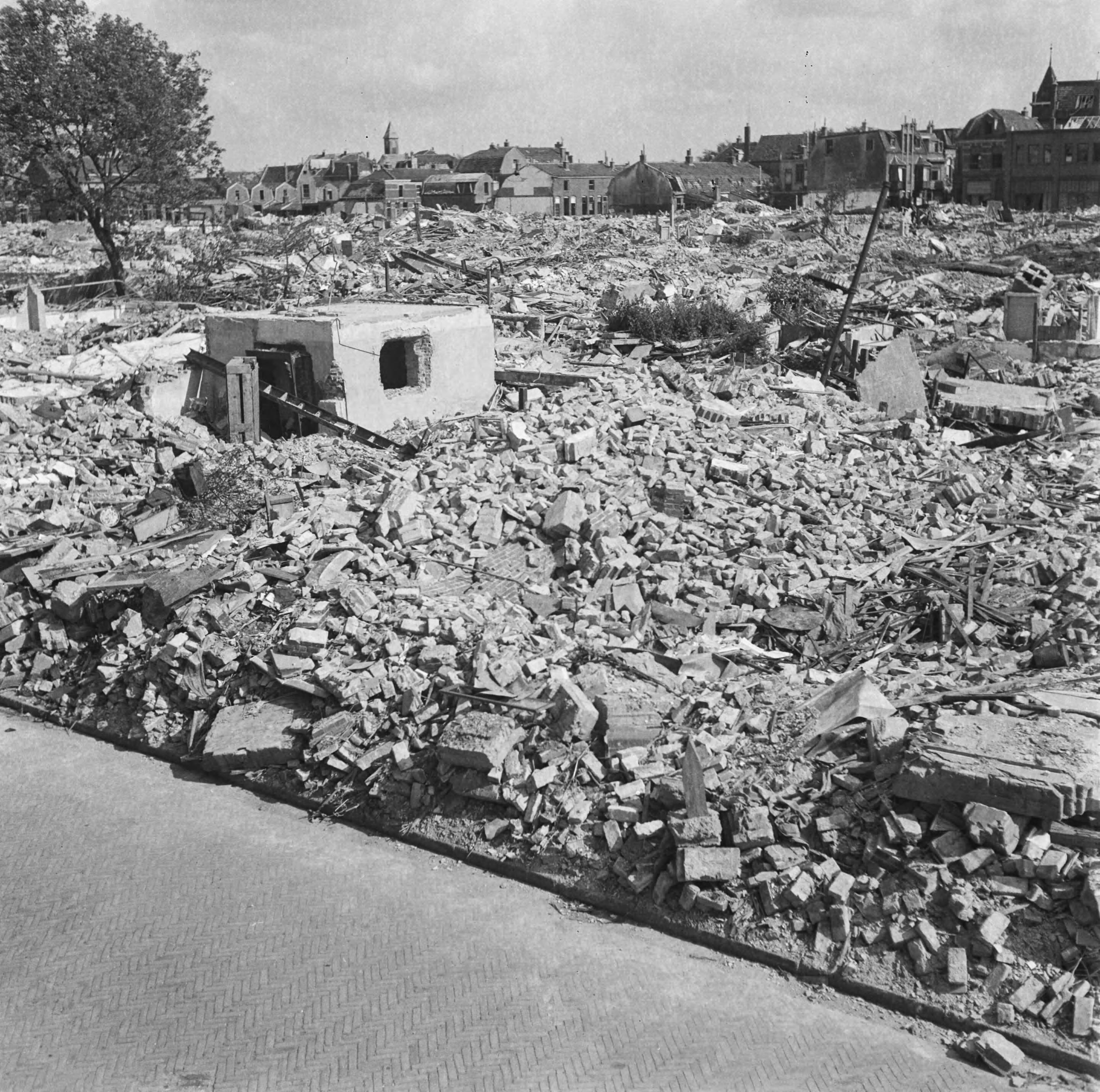 Puin van afgebroken verwoeste woningen