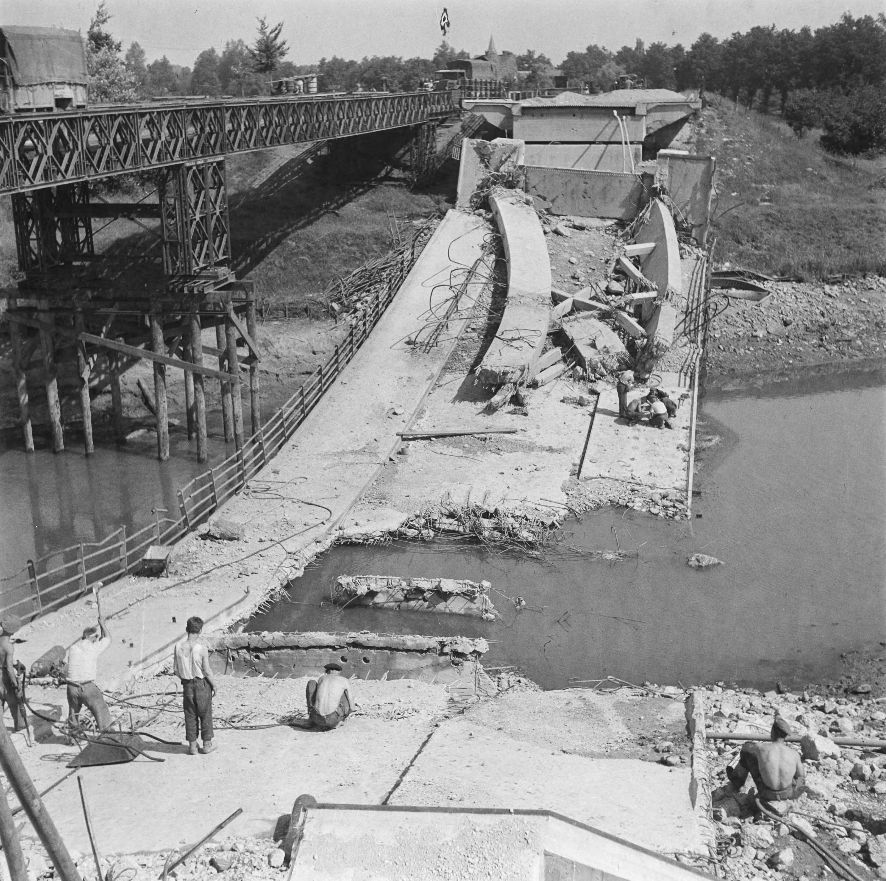 Verwoeste verkeersbrug met daarnaast baileybrug