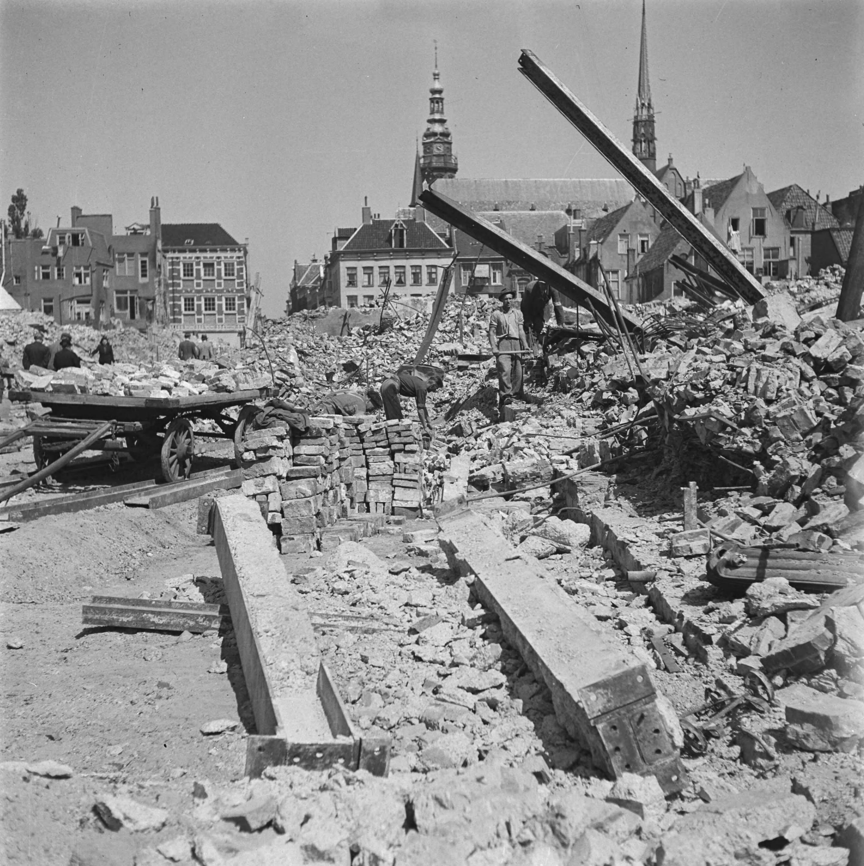 De verwoeste noordwand van de Grote Markt . Arbeiders zijn bezig bruikbare bouwmaterialen te verzamelen uit de ruines