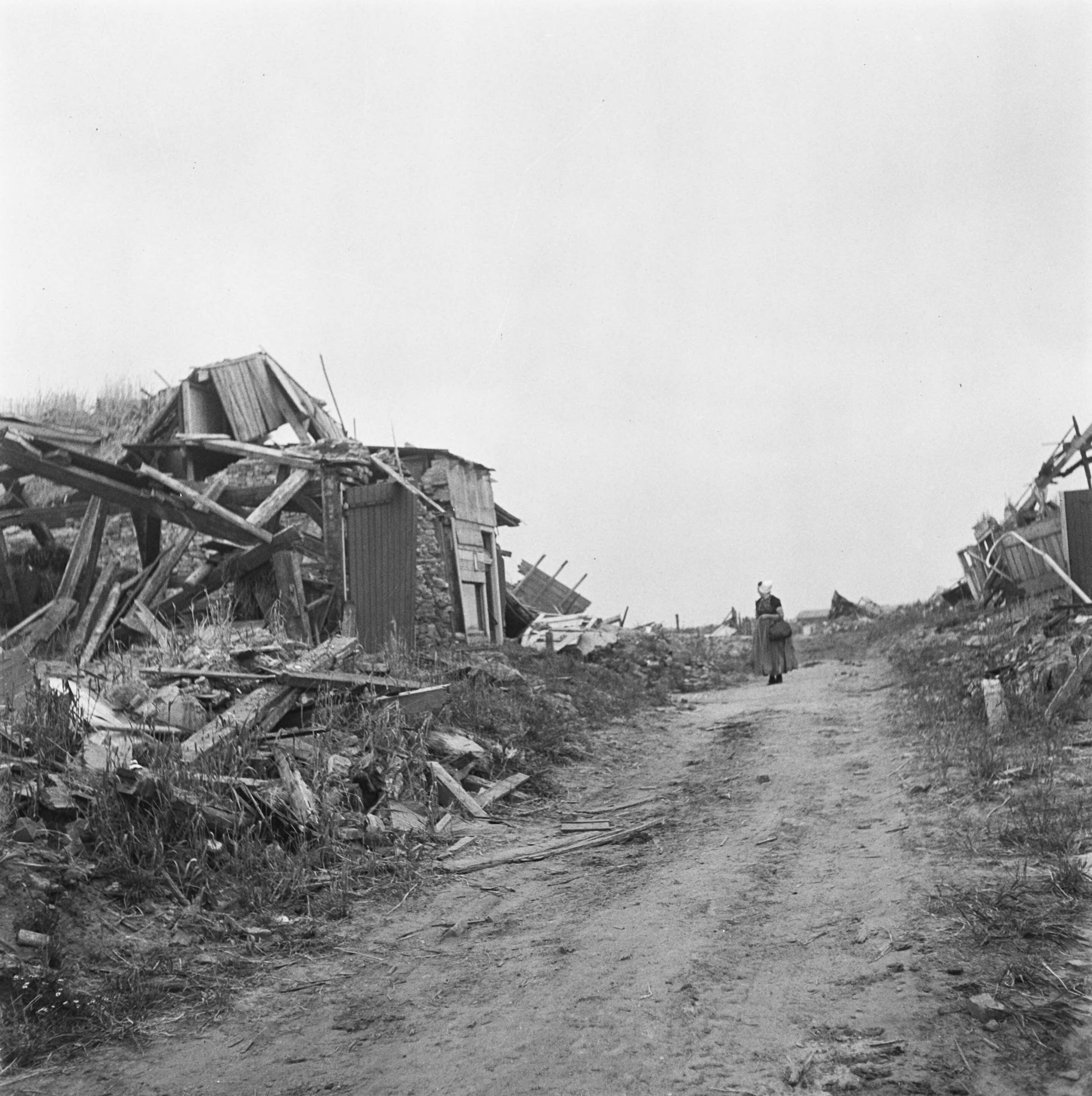 Vrouw in klederdracht temidden van verwoeste keten
