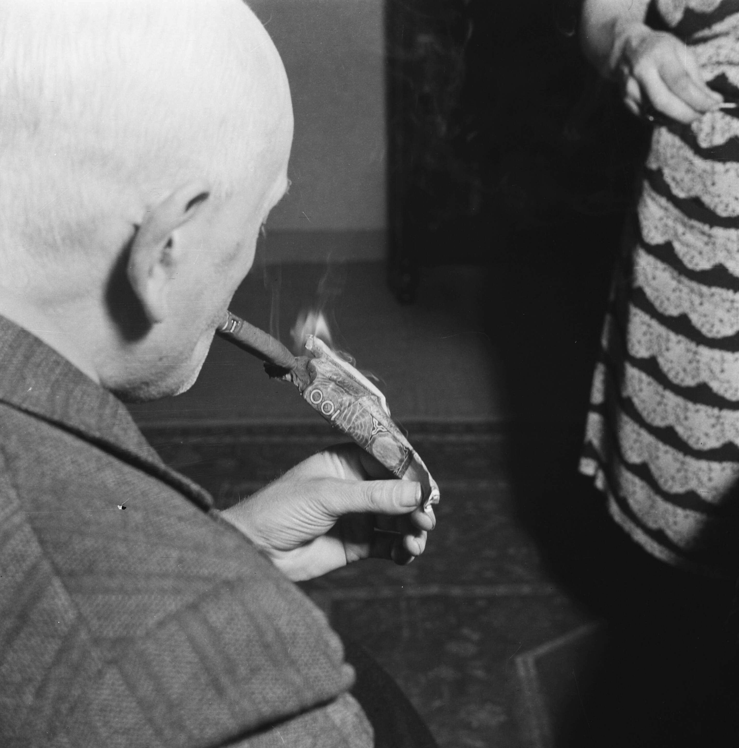 Man steekt sigaar aan met waardeloos geworden 100 gulden biljet