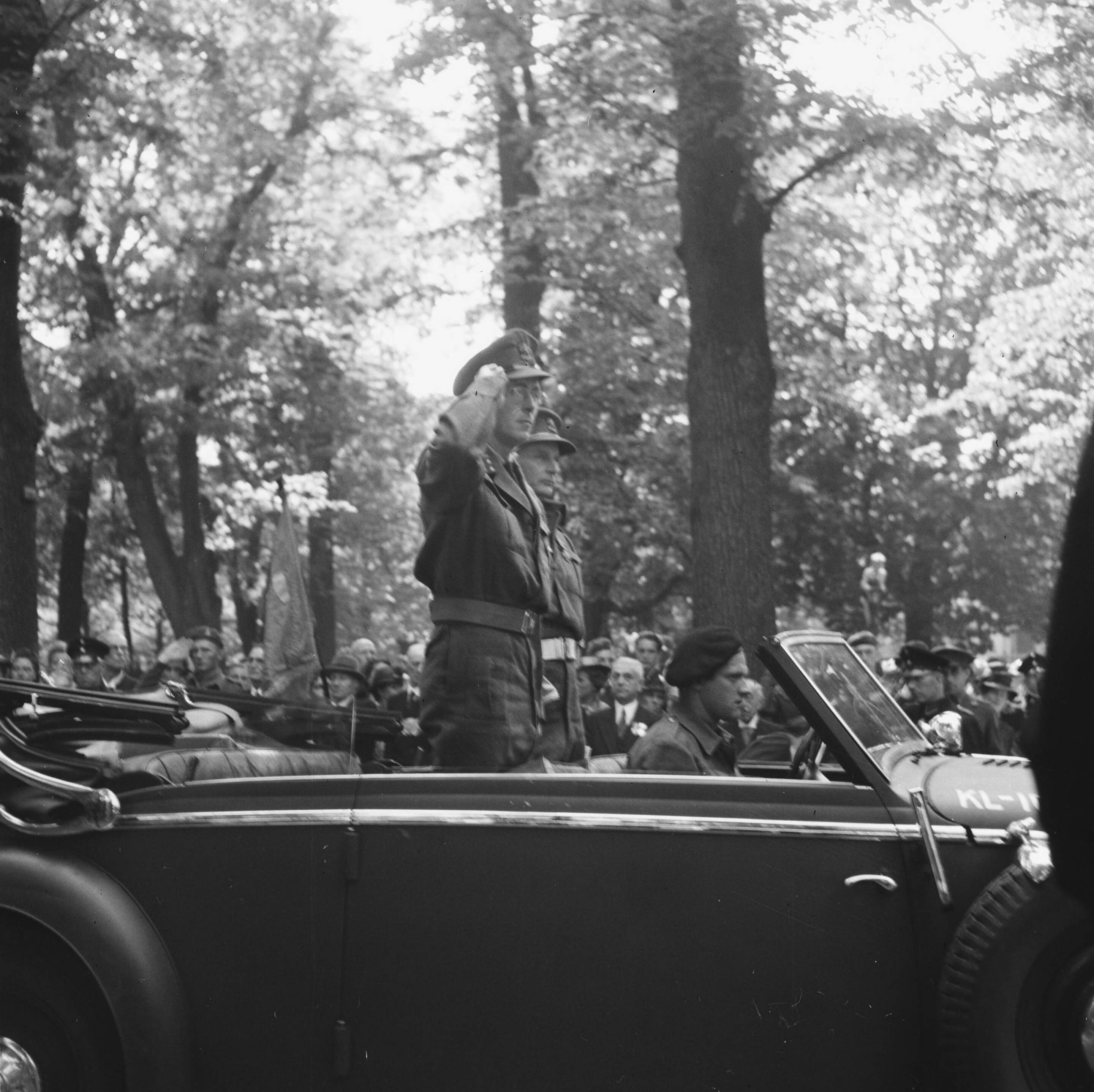 Parade over het Lange Voorhout. Prins Bernhard en commandant De Ruyter van Stevenink groeten vanuit een auto